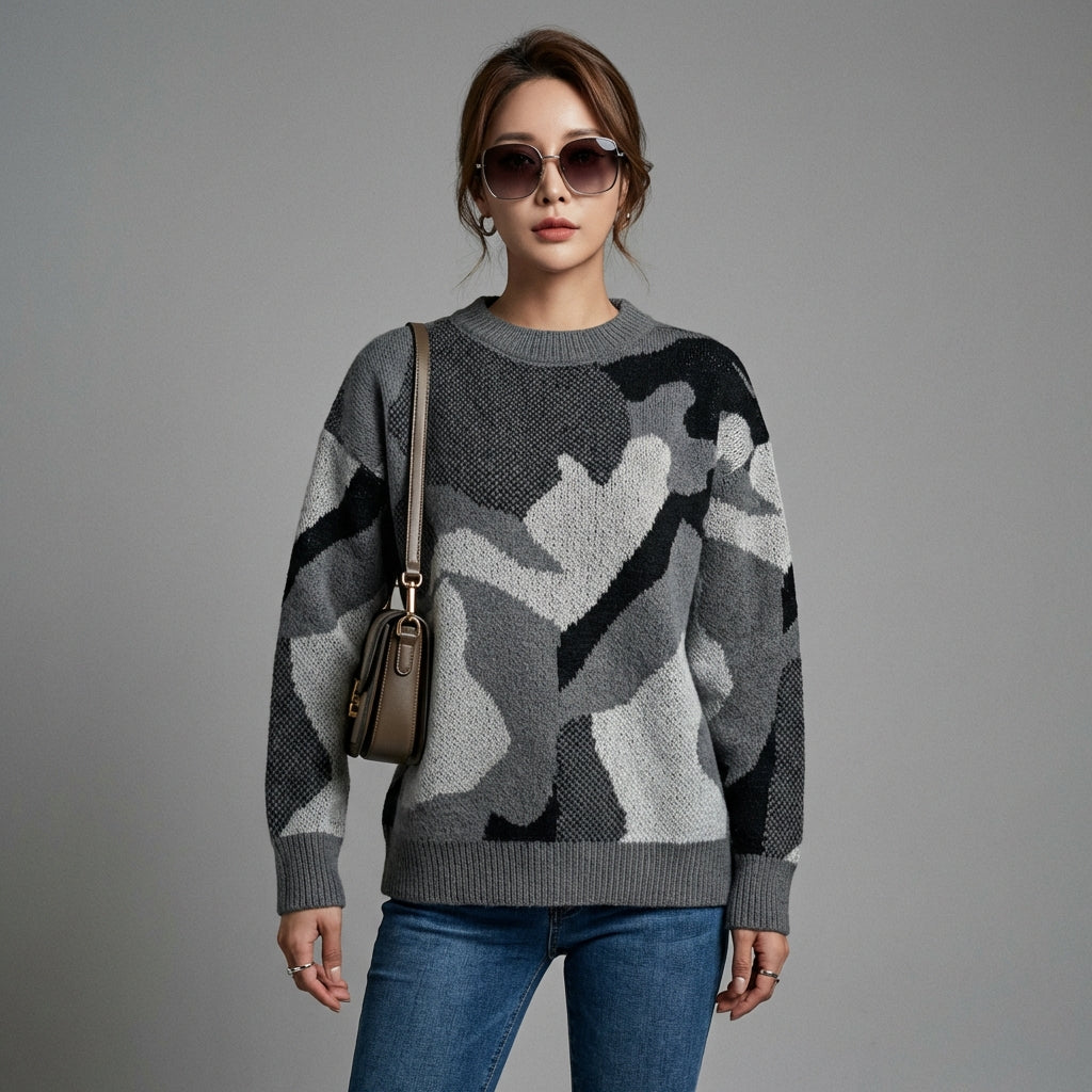 Pull jacquard décontracté gris pour femme - Koreanxwear