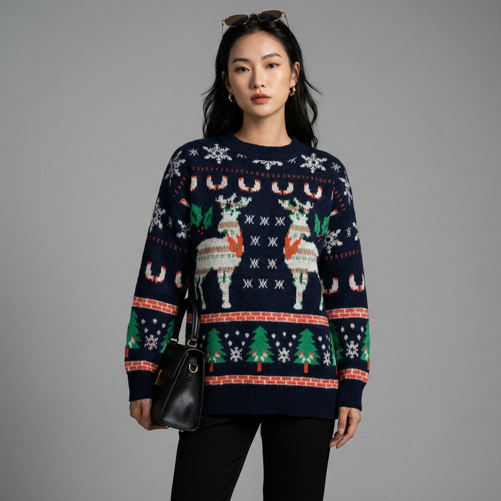 हमारे गोल गले वाले जैक्वार्ड स्वेटर के साथ एक ट्रेंडी और आरामदायक लुक अपनाएं, जो एक विशिष्ट हिरण के पैटर्न से सजा है। इसका "कलर ब्लॉकिंग" डिज़ाइन एक आधुनिक और चंचल स्पर्श जोड़ता है, जो आपके दिनों को रोशन करने के लिए एकदम सही है। आपकी अलमारी के लिए एक आरामदायक और स्टाइलिश आवश्यक! 🦌
