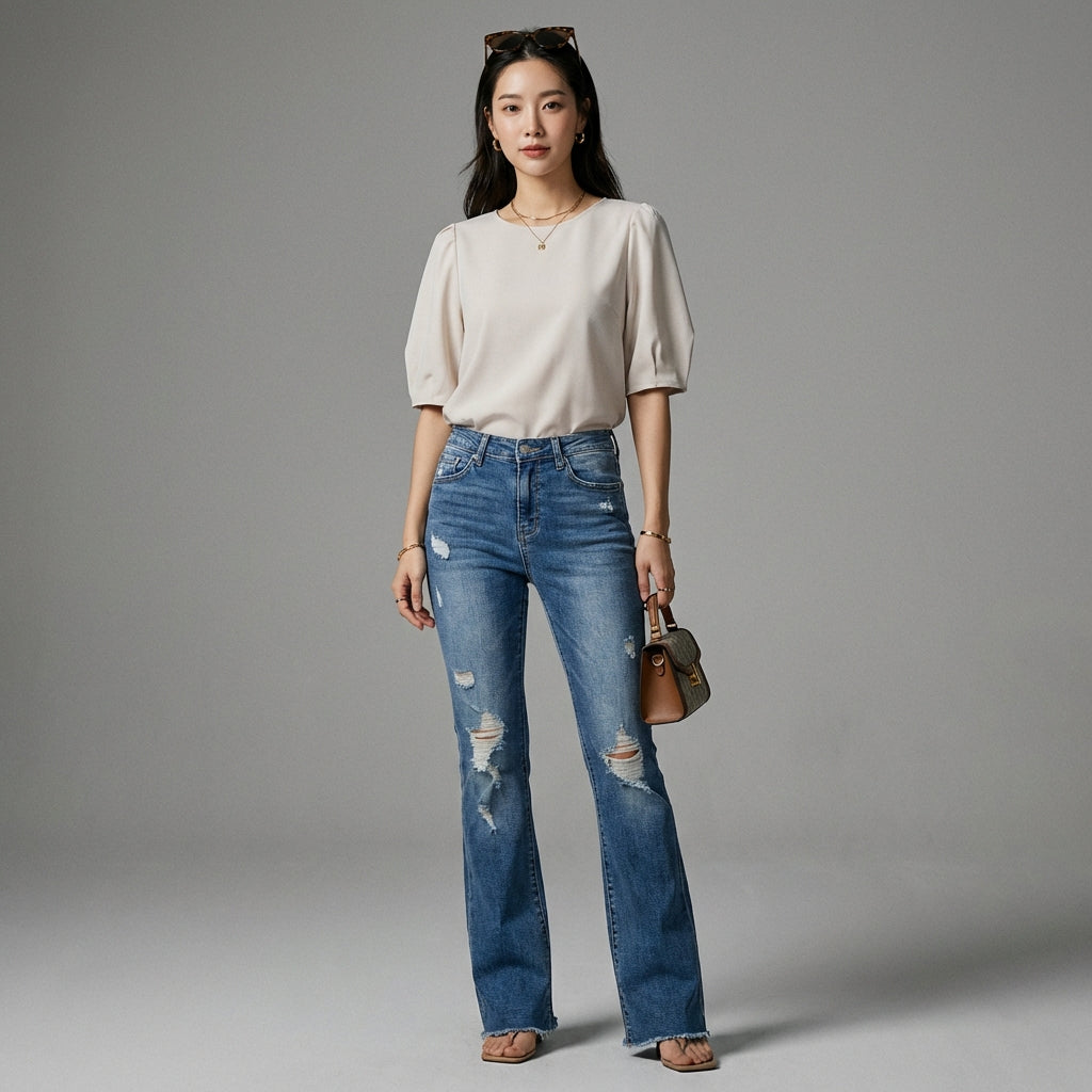 - प्रकार: बूटकट जींस, हाई-वेस्ट, वॉश्ड। एक आकर्षक कट जो आकृति को लंबा करता है, सही समर्थन के लिए एक हाई-वेस्ट और एक मजबूत शैली के लिए एक वॉश्ड प्रभाव के साथ।