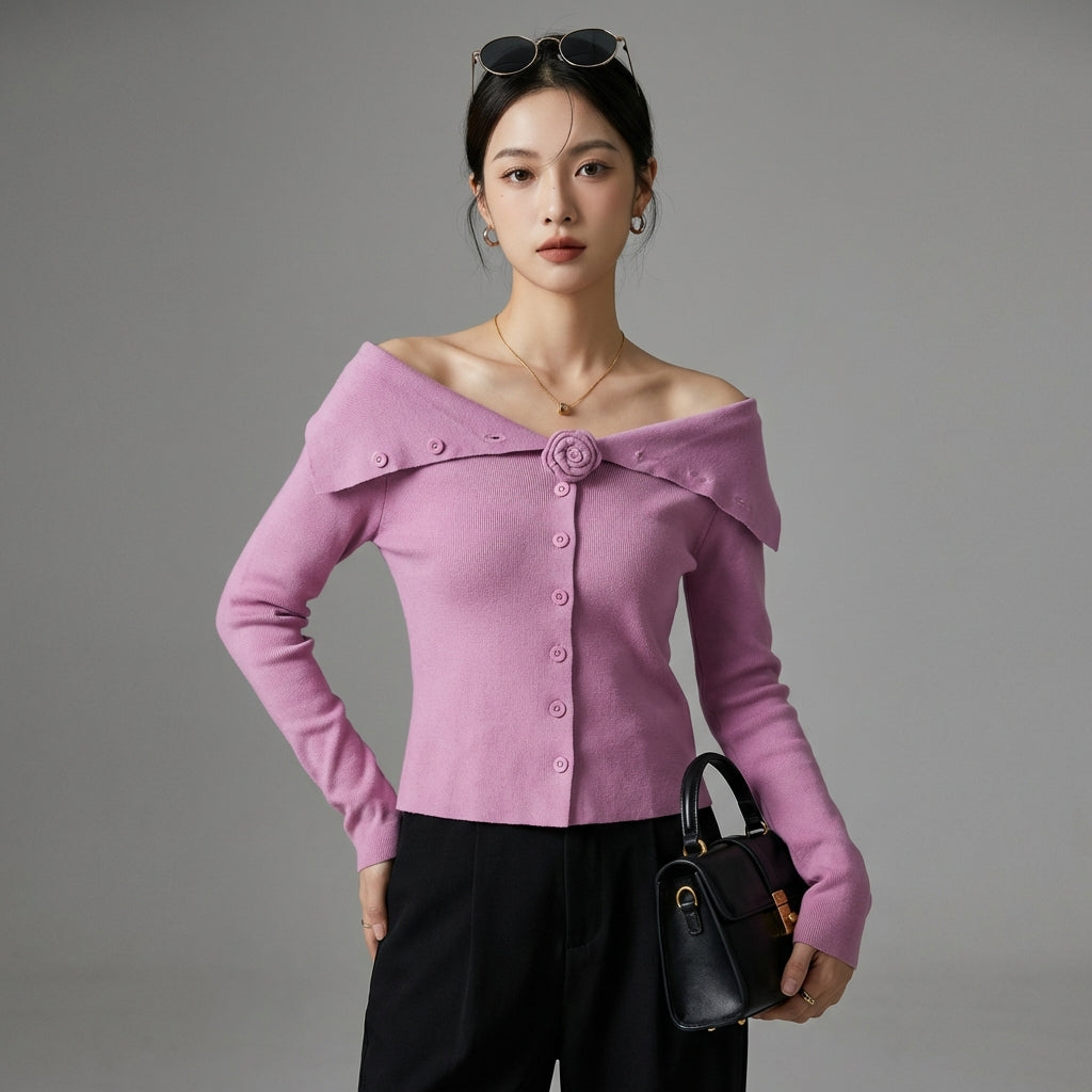 Cardigan fleur épaule dénudée noir - Style K-fashion femme