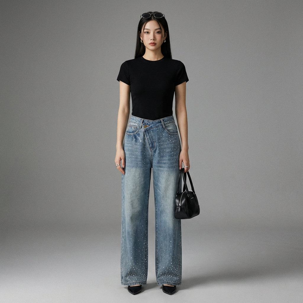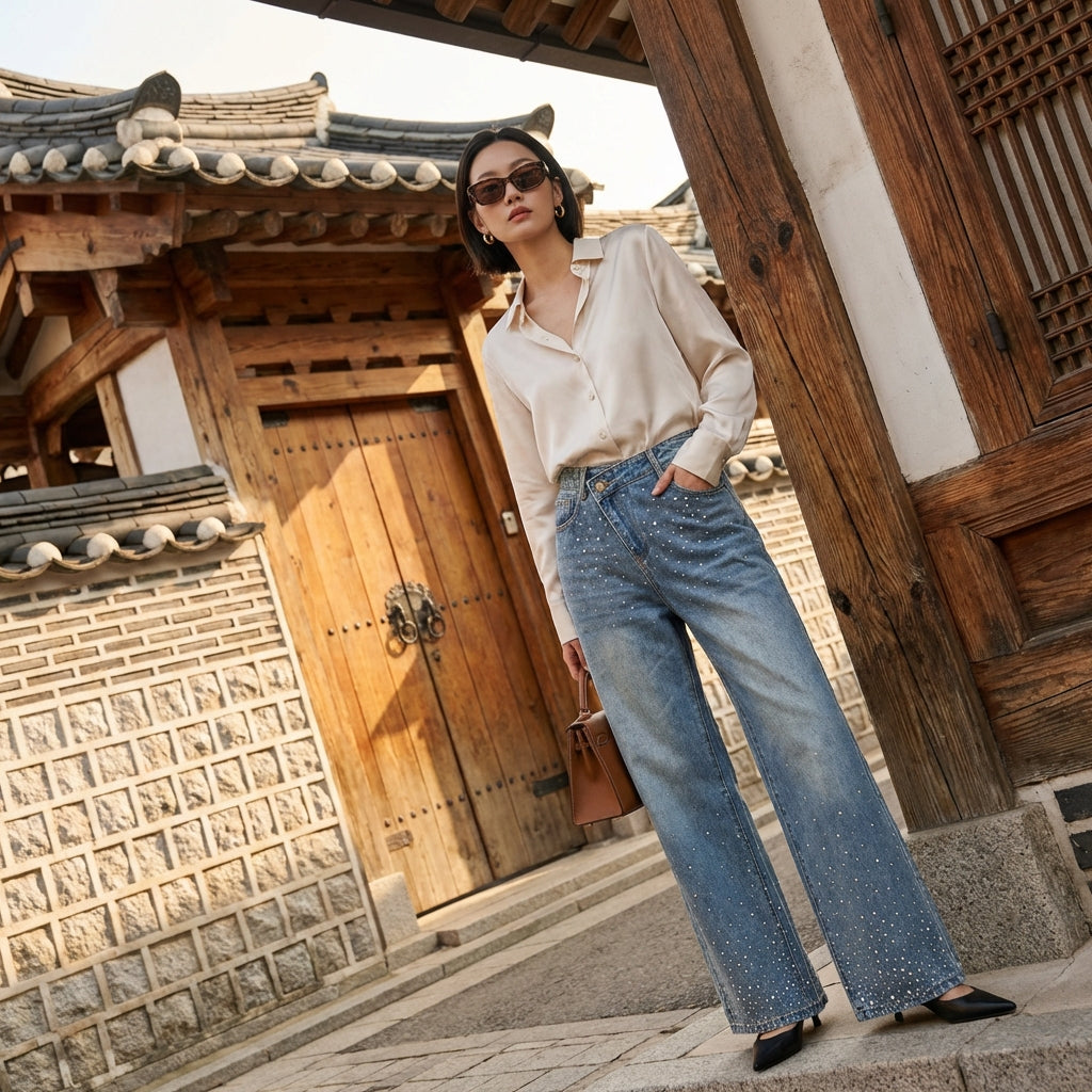 - प्रकार: स्ट्रेट-लेग जींस, मिड-राइज़। एक क्लासिक कट जो आकृति को लंबा करता है और आंदोलन की स्वतंत्रता के लिए आदर्श आराम प्रदान करता है।