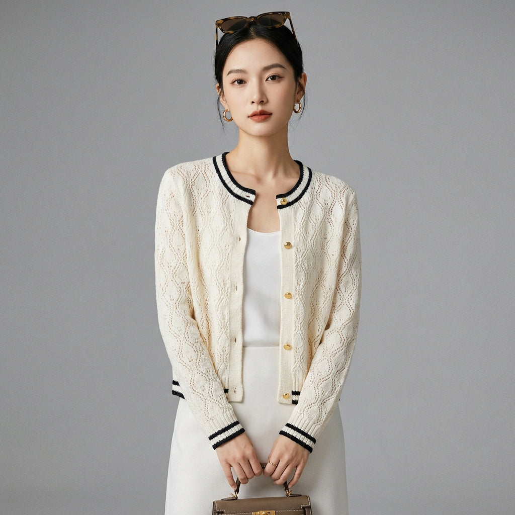 Tampil gaya chic dan kasual dengan kardigan rajut berlubang kami. Kerah bulat dan potongan pas badan menonjolkan siluet, sementara lengan panjang dan kancingnya menambahkan sentuhan elegan. Sempurna untuk hari-hari yang lebih sejuk! ✨