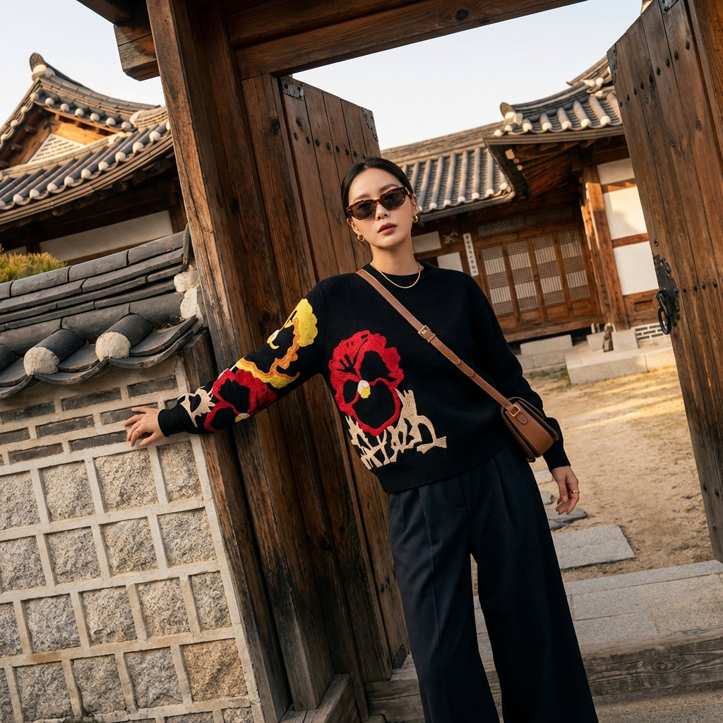 Sweater jacquard bordir ini adalah item utama untuk gaya unik, memadukan kenyamanan dan keanggunan dengan sentuhan inspirasi Korea.