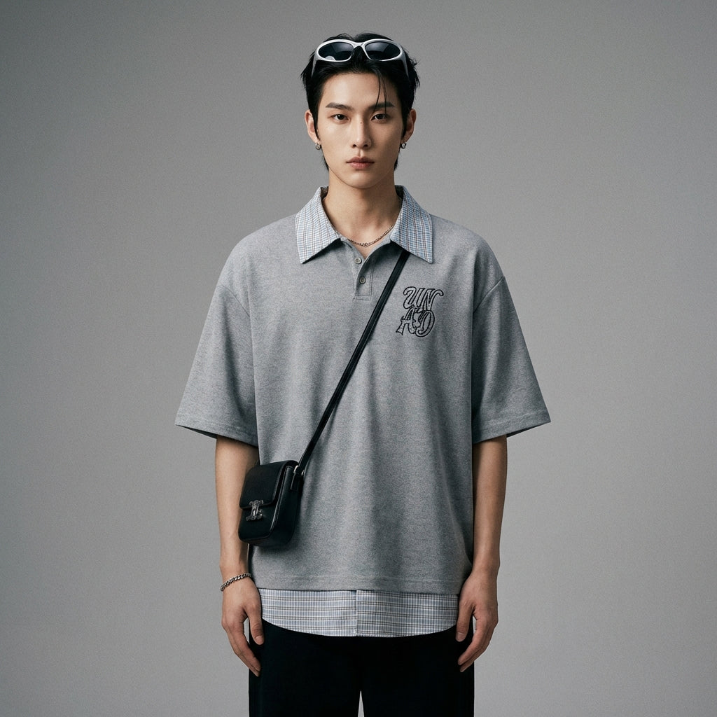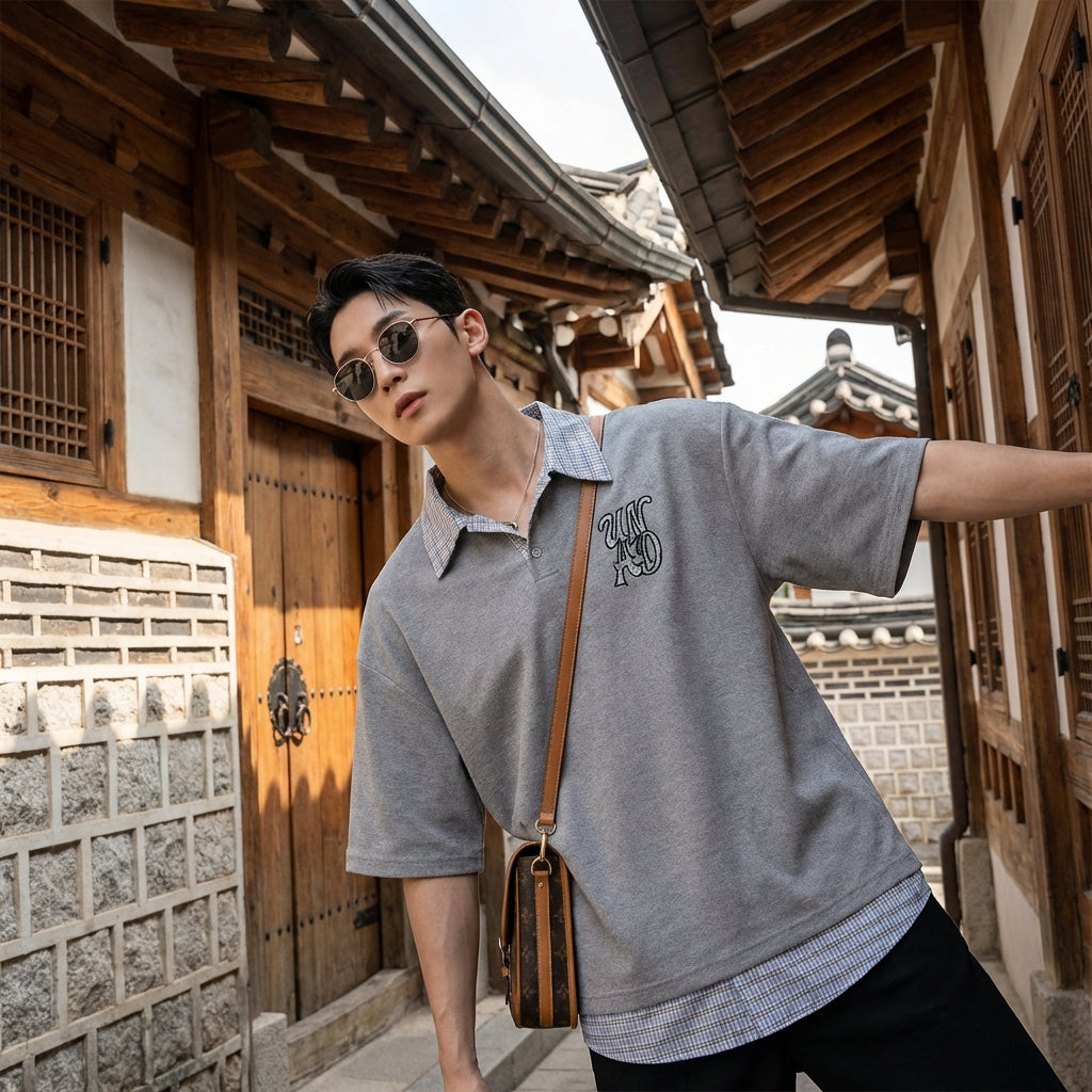 T-shirt ample à col cranté et carreaux - Mode Streetwear Coréenne
