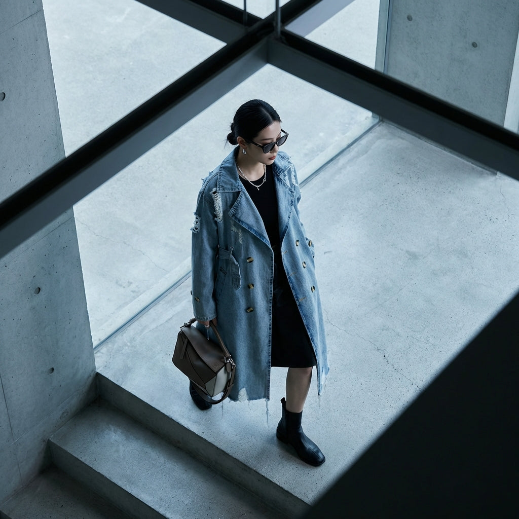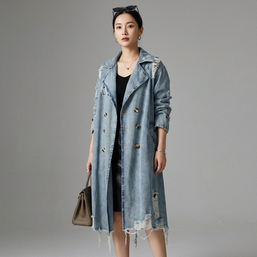 Tegaskan gaya Anda dengan trench coat denim panjang kami, sebuah pakaian yang berani dan modern. Dengan kerah berlekuk yang elegan dan lengan panjang, mantel berkancing ganda ini menawarkan siluet yang canggih dengan sentuhan kasual dan trendi. Sempurna untuk mereka yang suka menonjol! ✨
