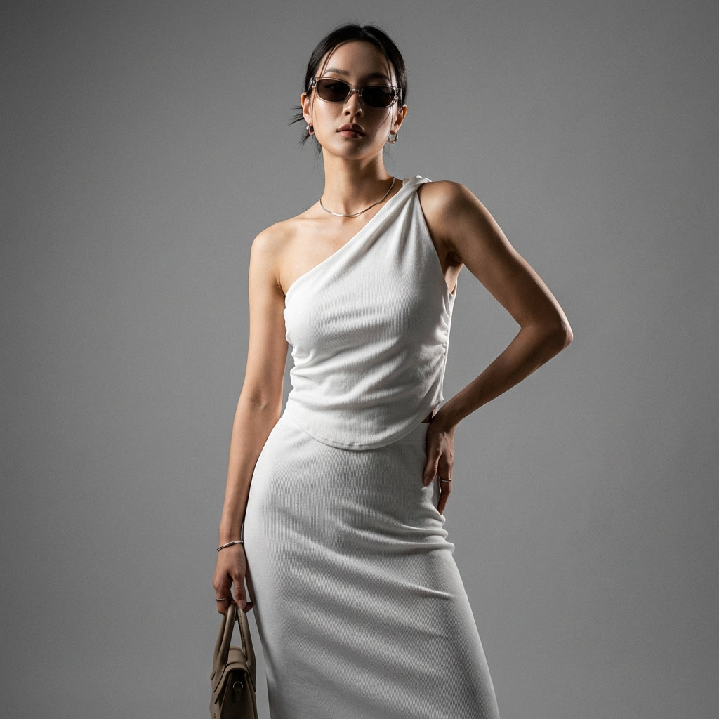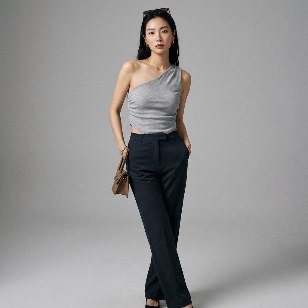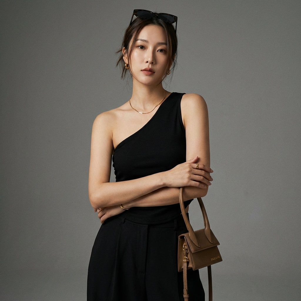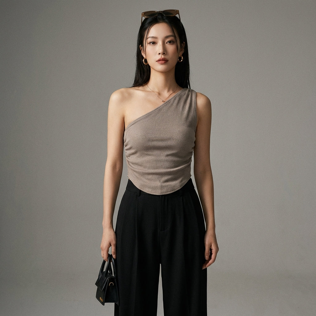 - Tipe: Tank top asimetris, Potongan pas badan. Potongan yang dirancang untuk mempercantik siluet sekaligus memastikan kenyamanan optimal.