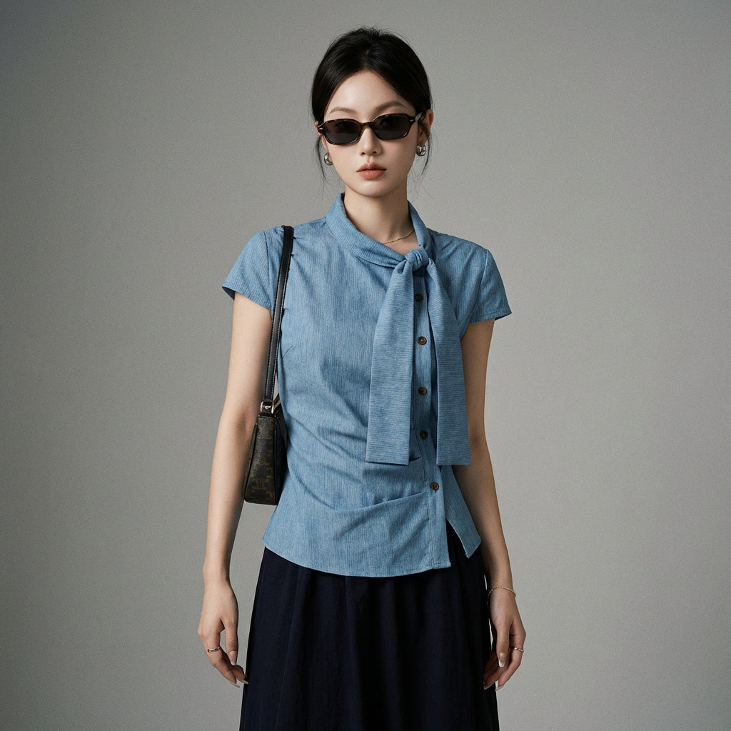 Tampil segar dan trendi dengan blus lengan pendek kami, dihiasi pita halus dan lipatan lembut. Desain asimetris dan garis-garisnya menghadirkan sentuhan orisinalitas dan kelembutan pada gaya Anda! 🎀