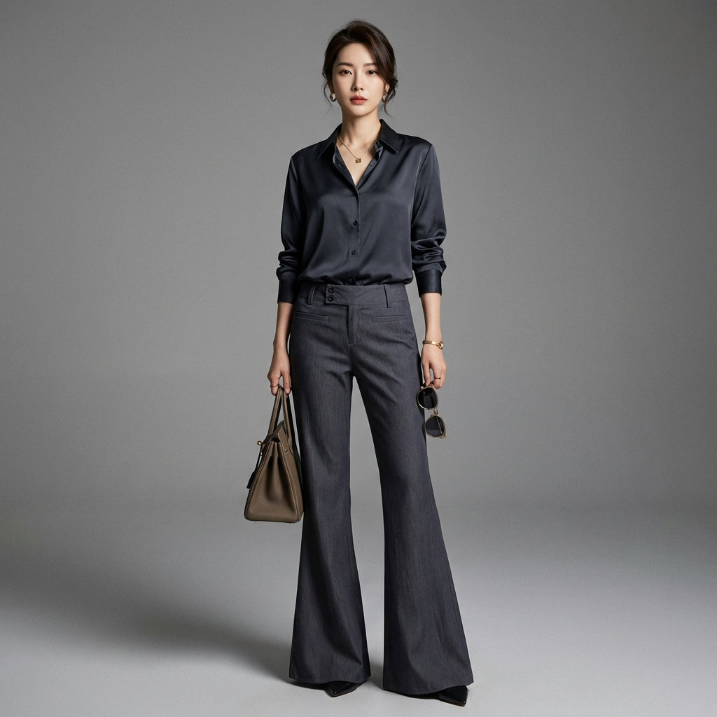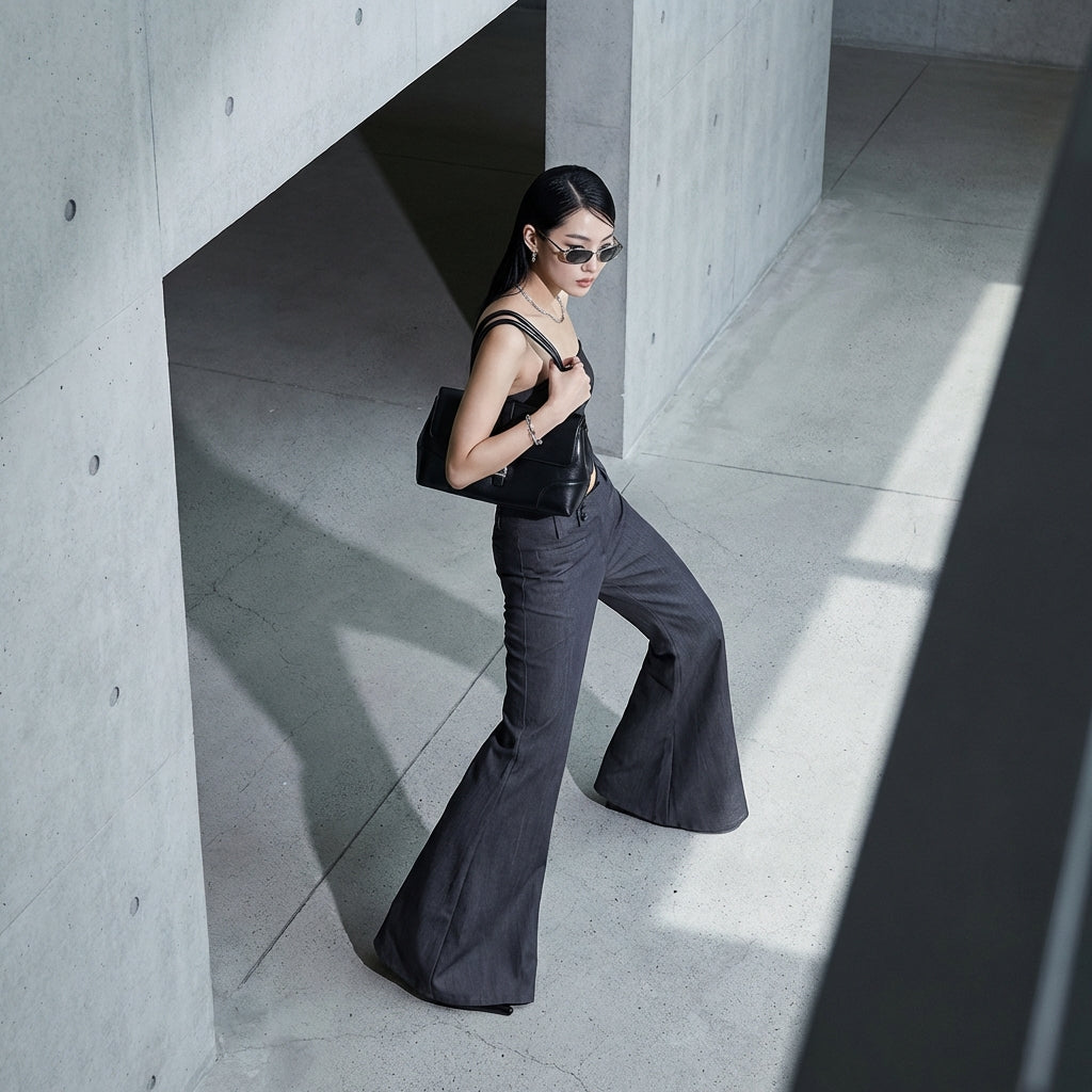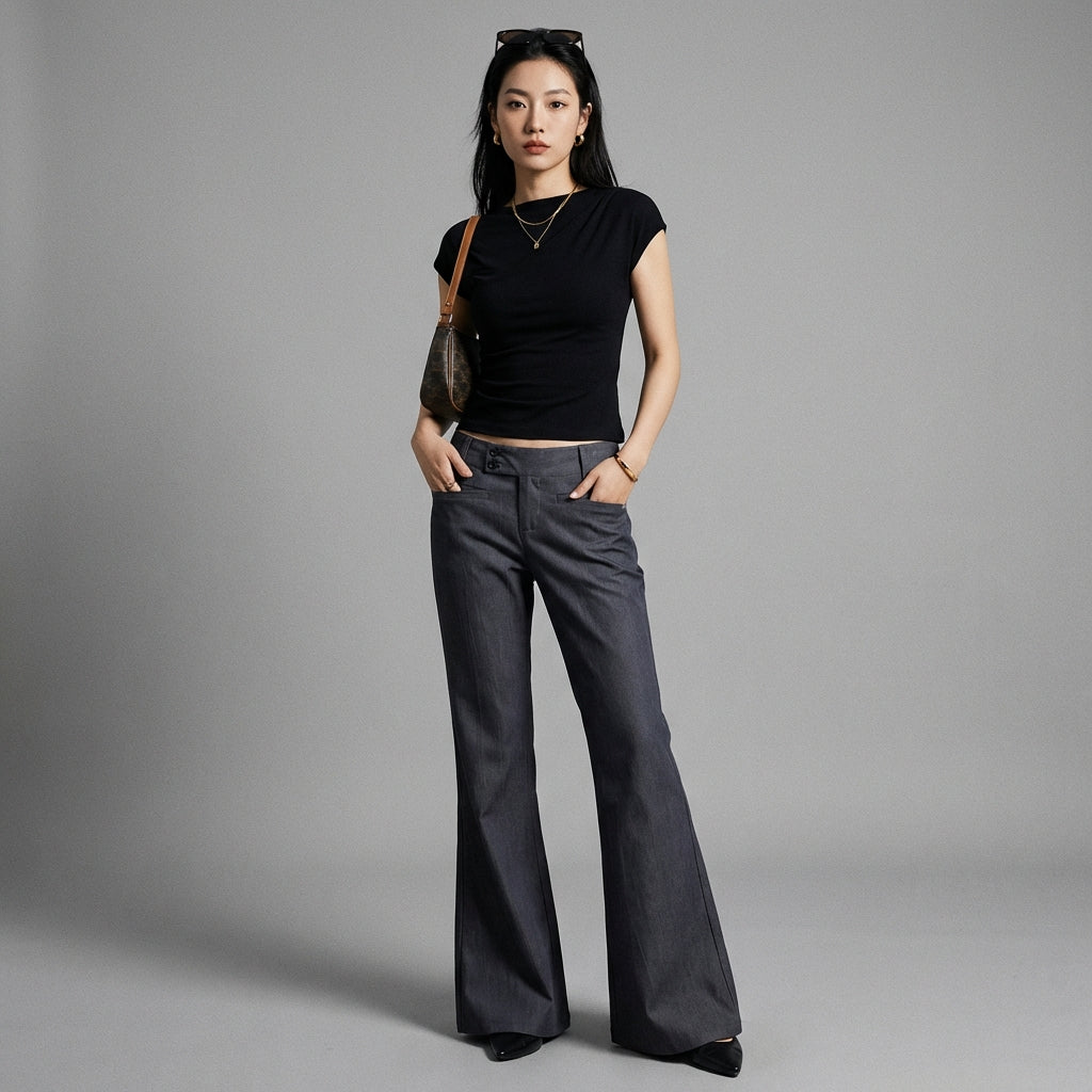 - Tipe: Flare, Pinggang rendah, Slim. Potongan modern yang menonjolkan siluet dengan sentuhan orisinalitas.