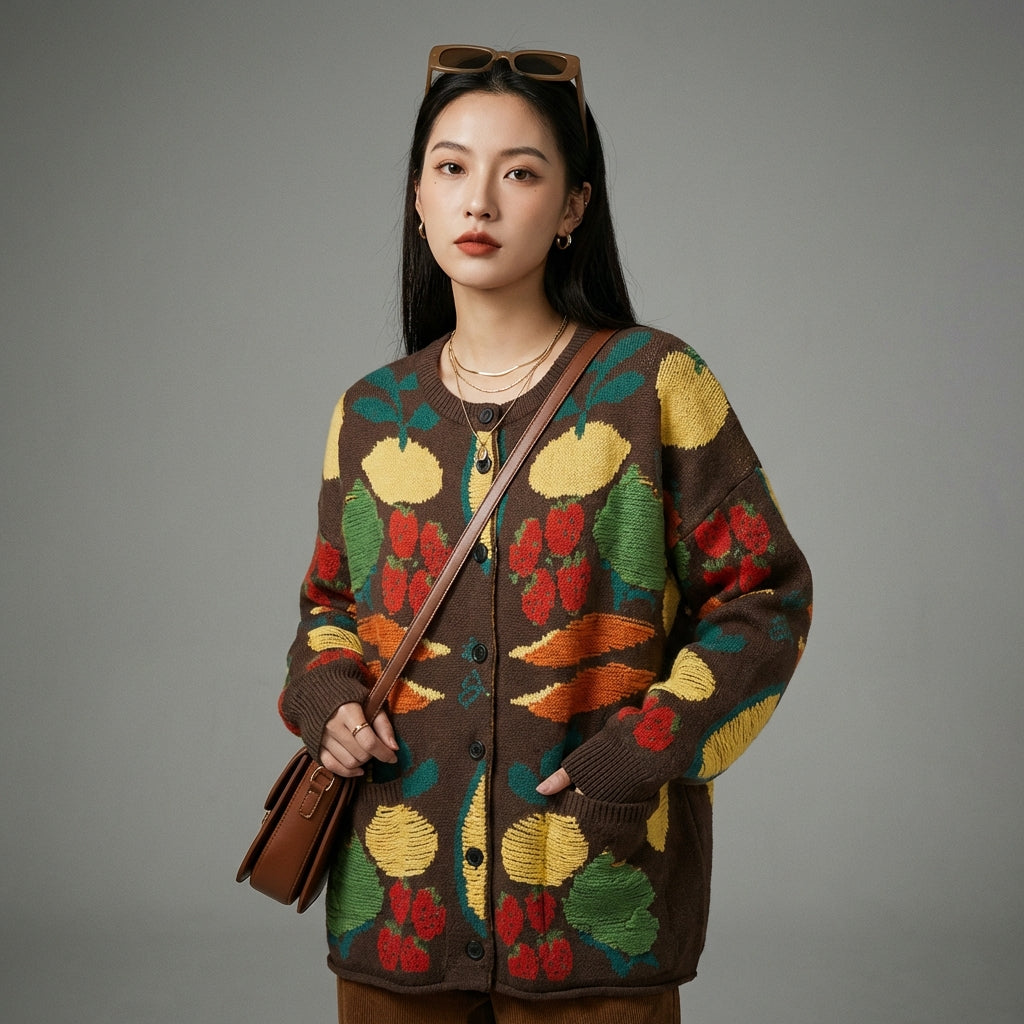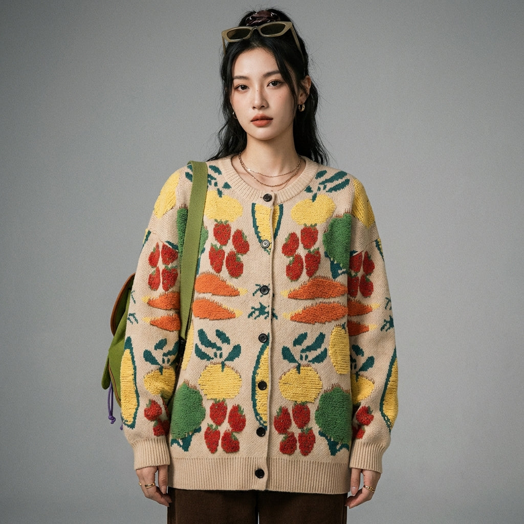 Cardigan jacquard oversize avec motifs de fruits - Koreanxwear