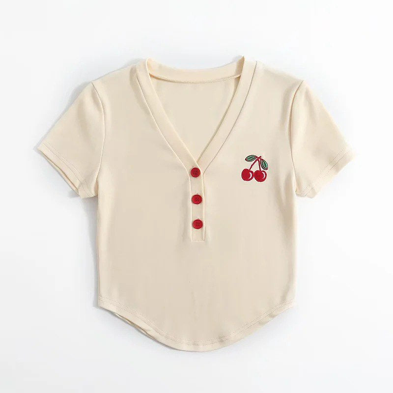 Tampil trendi dan ringan dengan kaus crop kami yang dihiasi bordir ceri yang menawan. Kerah V dan potongan pas badan menonjolkan siluet Anda, sempurna untuk hari-hari cerah! 🍒
