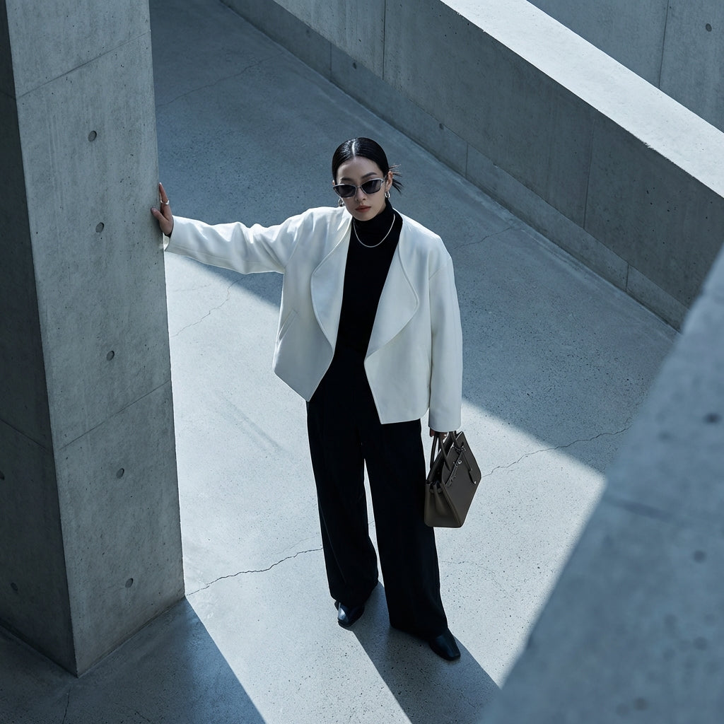 - Tipe: Cropped, Oversize, Lengan Panjang. Potongan pendek dan longgar, dengan kerah lapel, untuk gaya yang tegas dan modern.