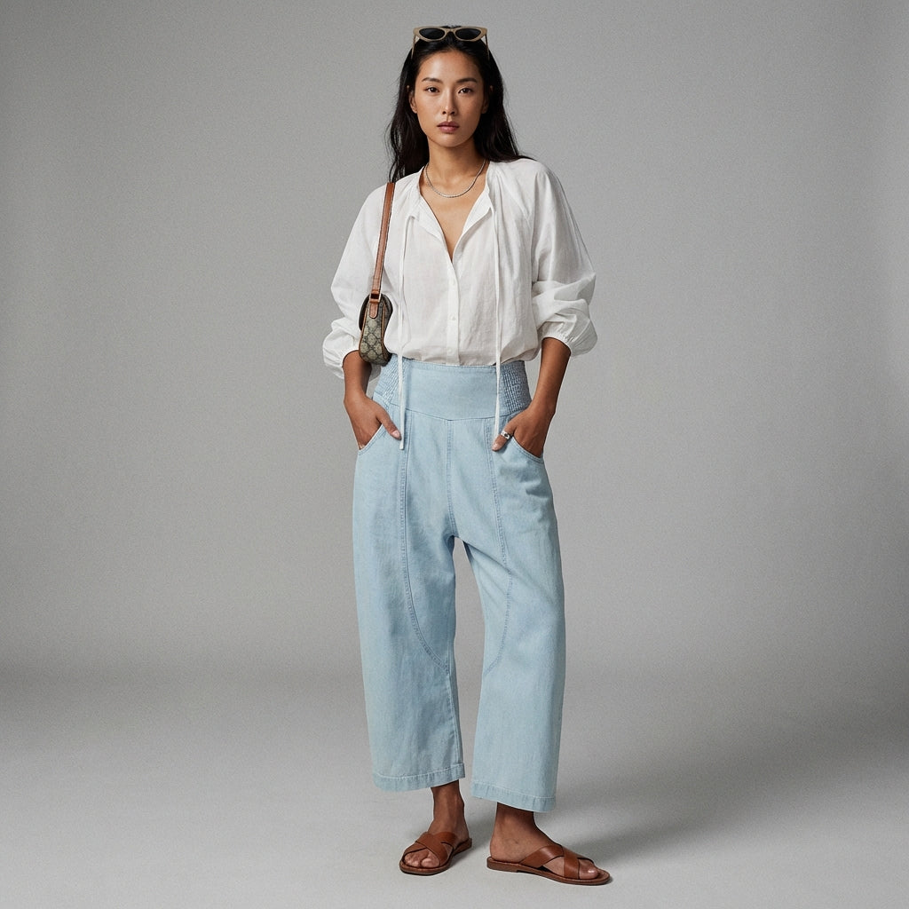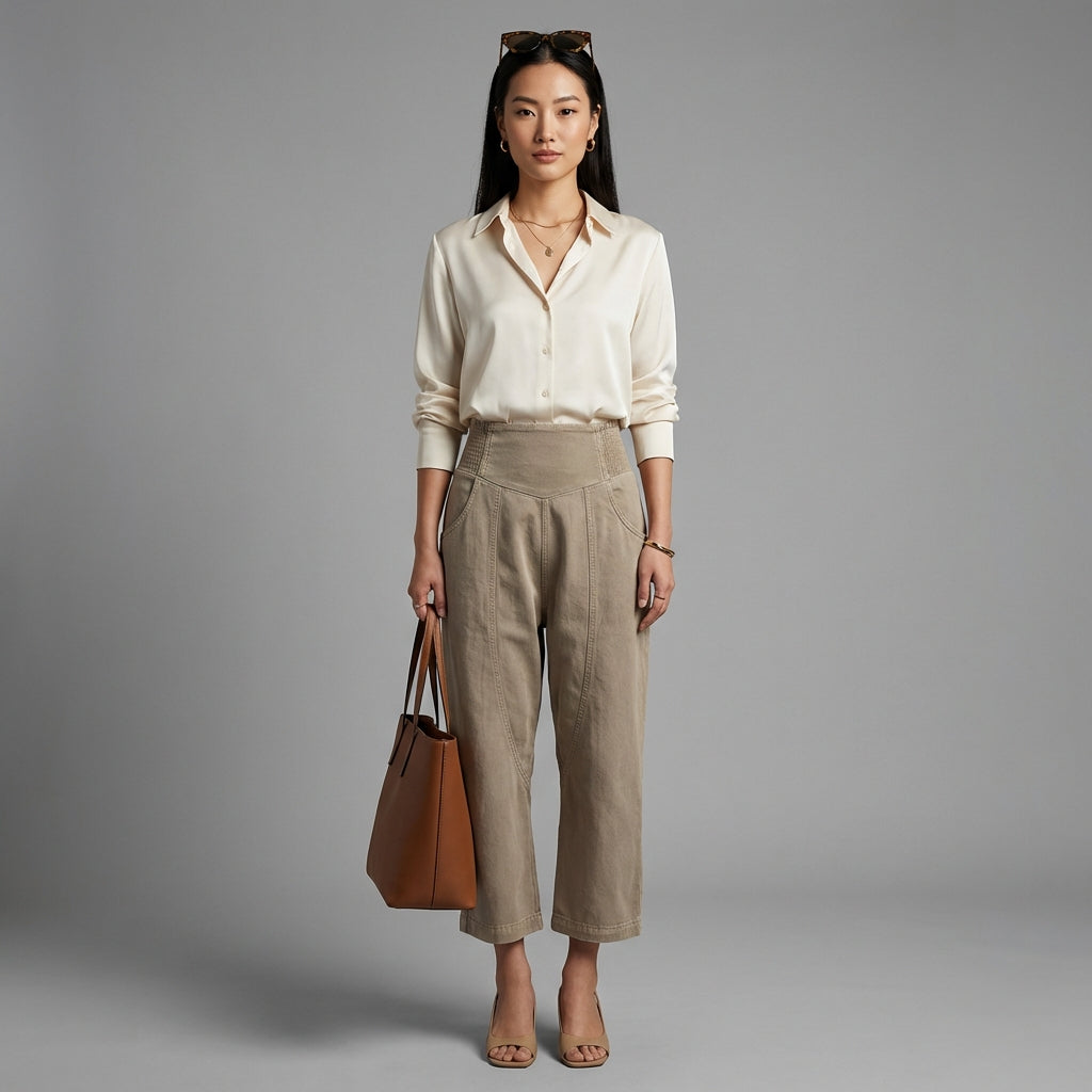 - Tipe: Celana lurus, Cropped. Potongan yang menyanjung yang memanjangkan siluet dan menonjolkan sepatu, ideal untuk tampilan kontemporer.