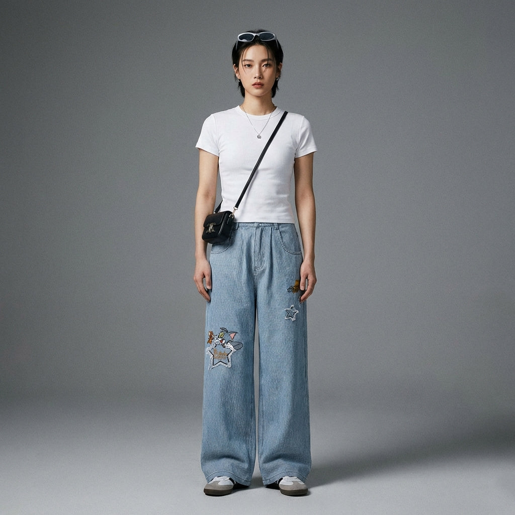 Jeans lurus bordir ini adalah item utama untuk menciptakan pakaian yang stylish dan nyaman, memadukan yang terbaik dari mode Korea dan streetwear.