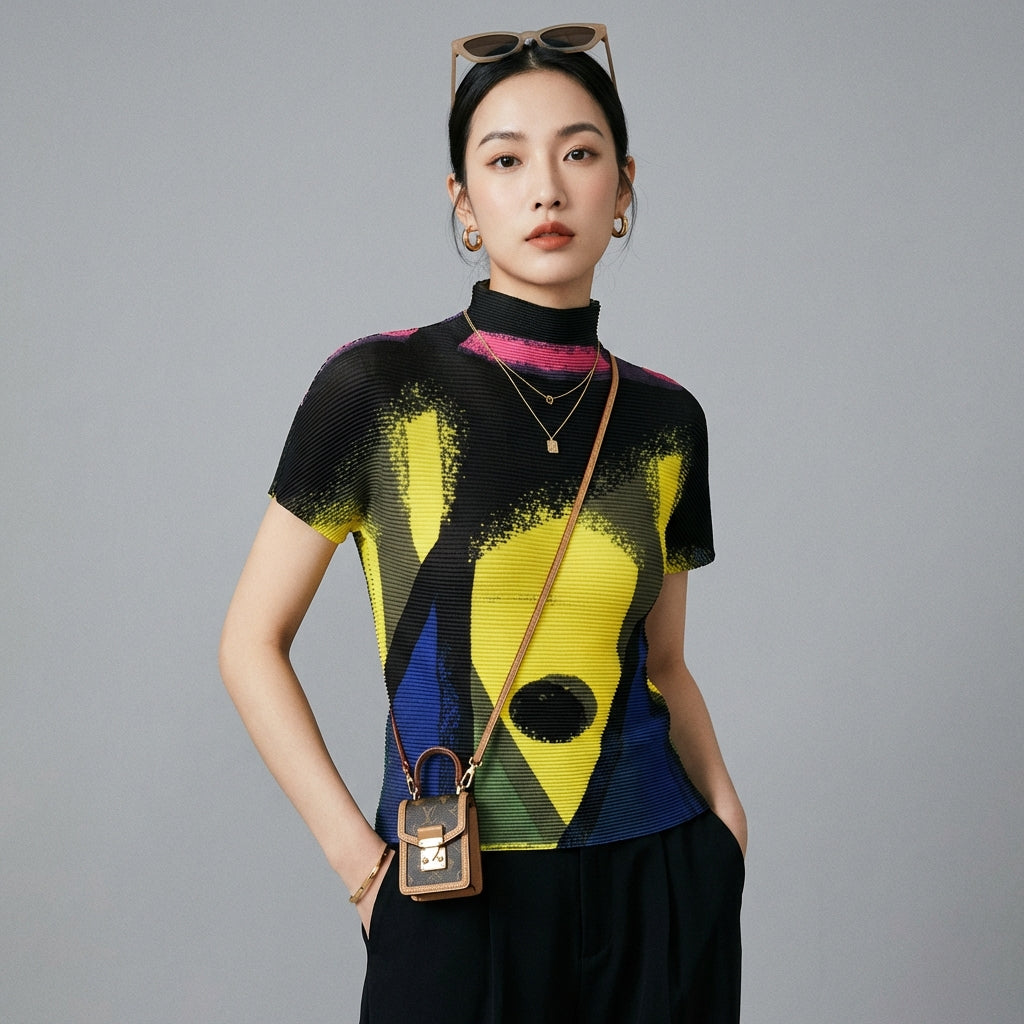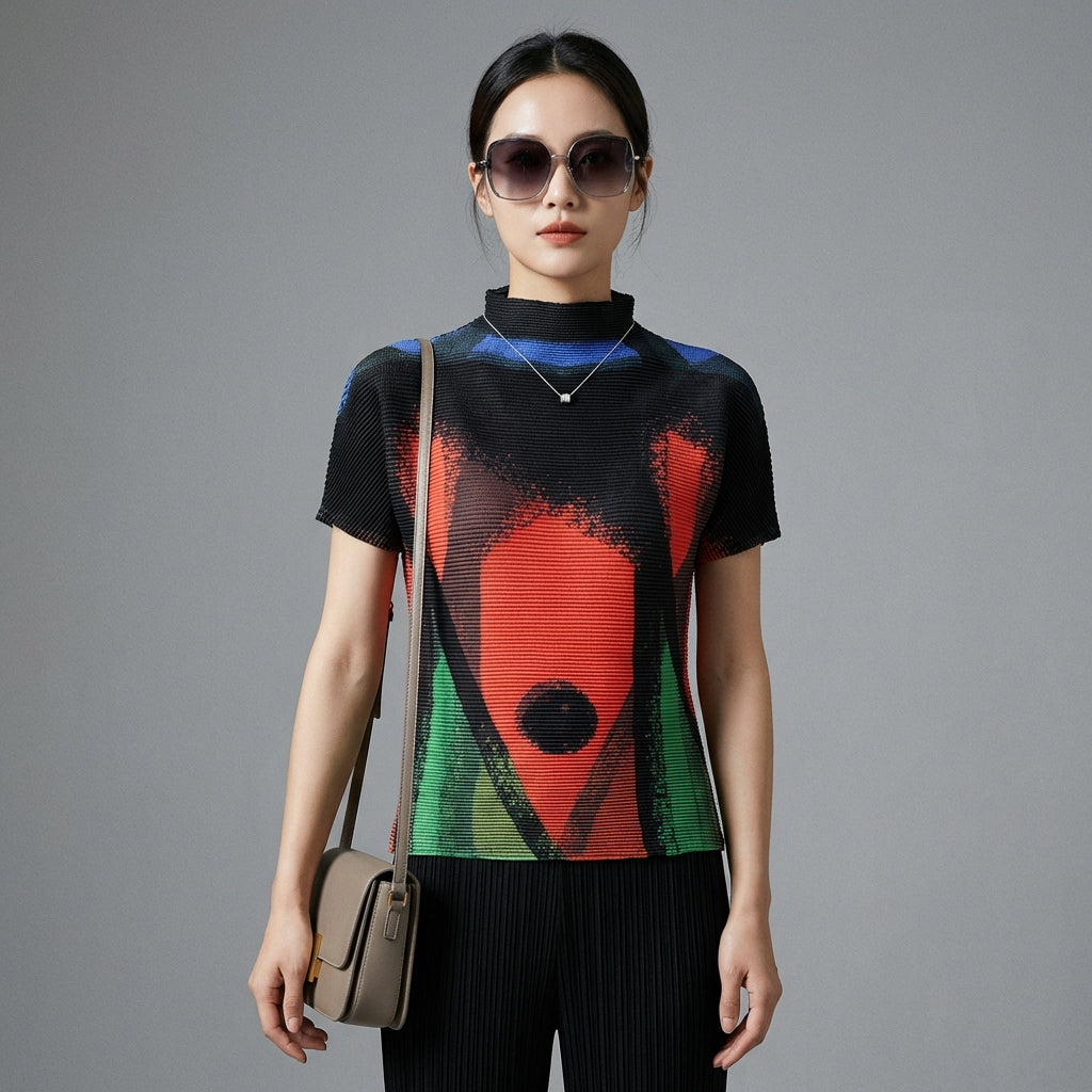 Afferma il tuo stile con la nostra t-shirt a collo alto e maniche corte, impreziosita da una stampa geometrica audace. Il suo taglio aderente valorizzerà la tua silhouette, perfetta per un look estivo e di tendenza! ☀️