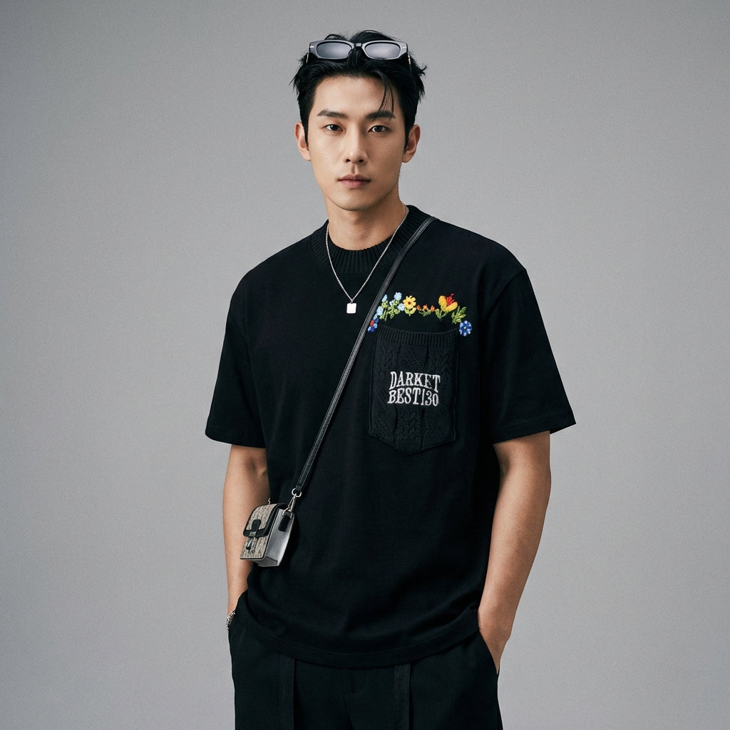 T-shirt noir brodé floral streetwear homme - Koreanxwear