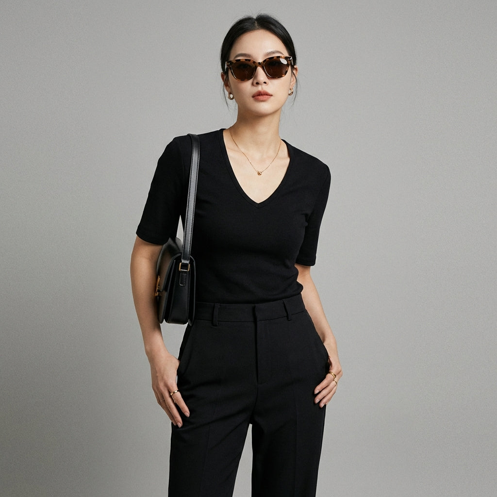 Adotta un look chic ed essenziale con la nostra T-shirt aderente con scollo a V e maniche corte. Ideale per valorizzare la tua silhouette, combina stile e comfort per tutte le tue occasioni! ✨