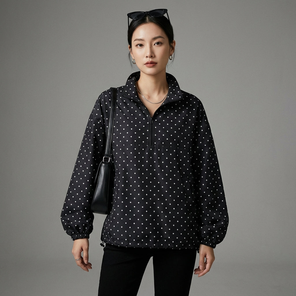 Adotta un look casual e alla moda con la nostra giacca ampia a mezza zip con stampa a pois. Il suo collo alto e il taglio oversize la rendono un capo comodo ed elegante, perfetto per tutte le tue fughe urbane! 🌟