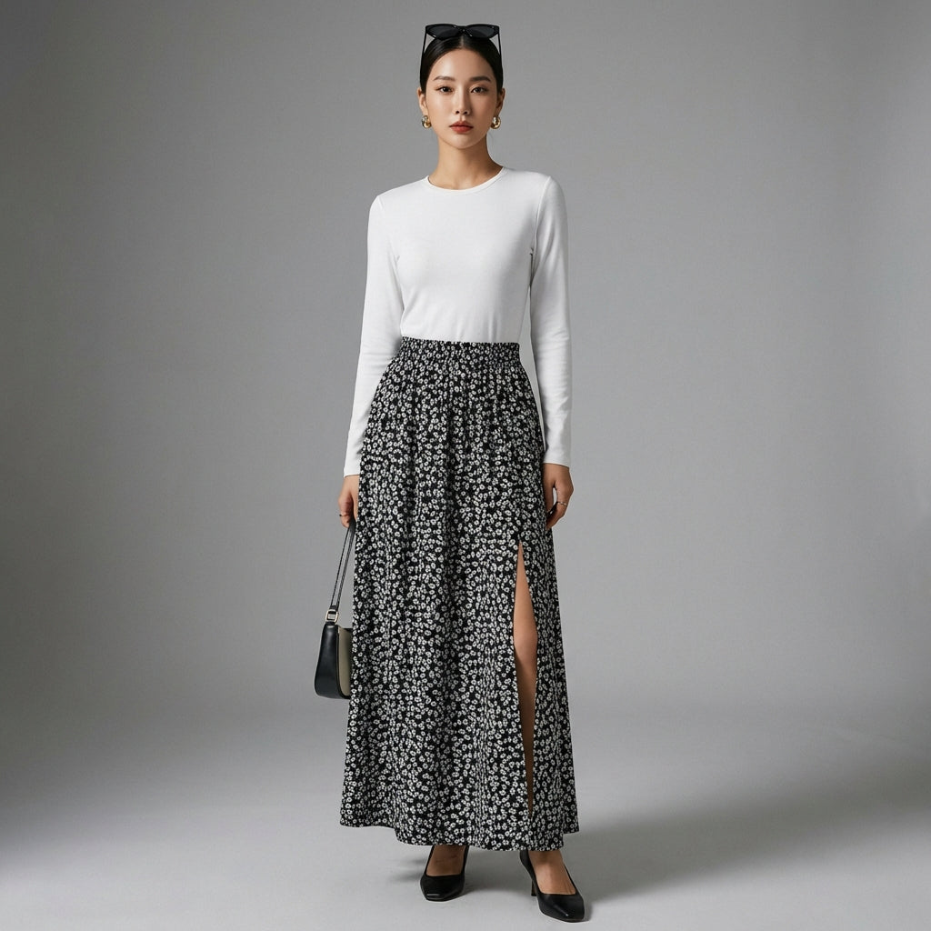 Tampil santai namun sofistikated dengan skirt labuh belah pinggang tinggi kami. Corak bunga yang halus dan potongan A-line memberikan siluet yang elegan dan selesa, sesuai untuk semua majlis! 🌸