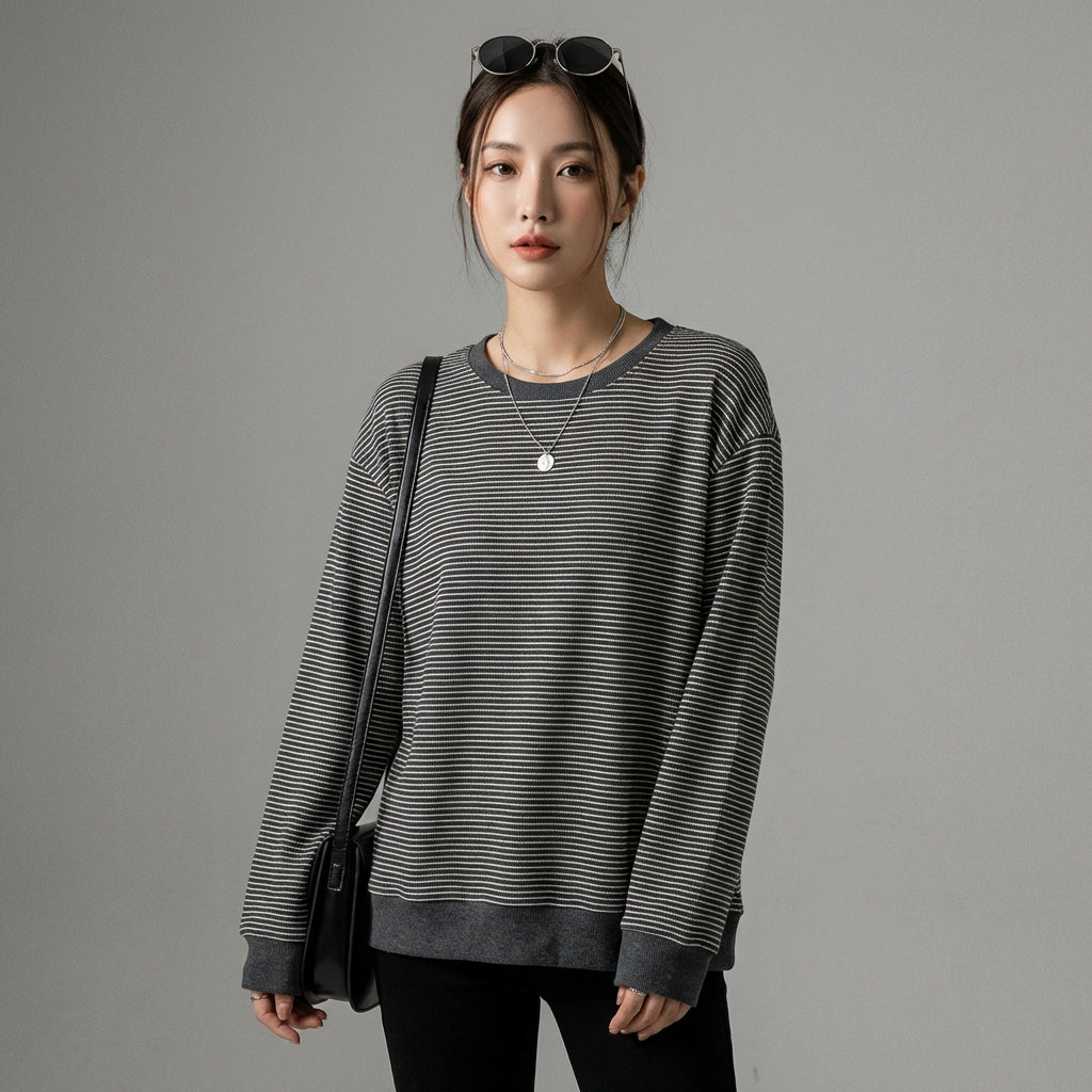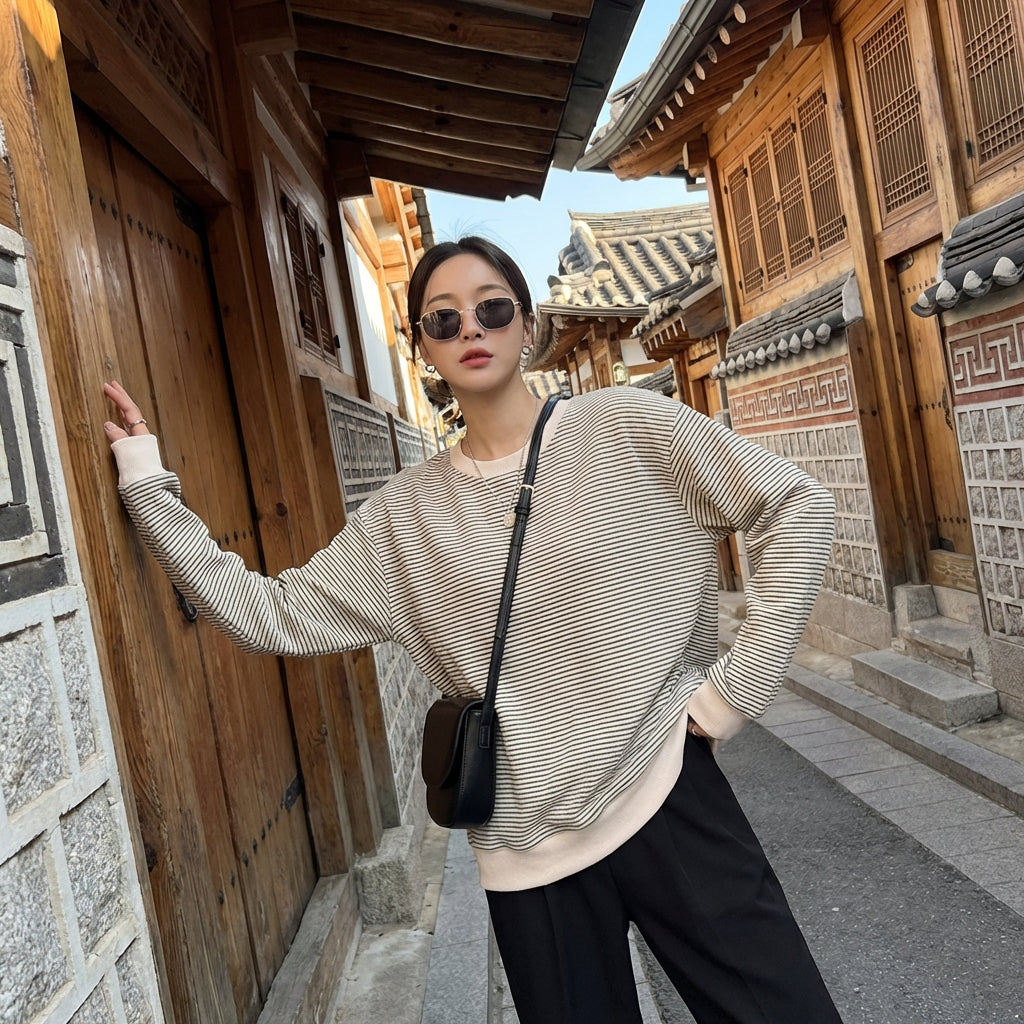 Sweat rayé décontracté col rond oversize - Koreanxwear