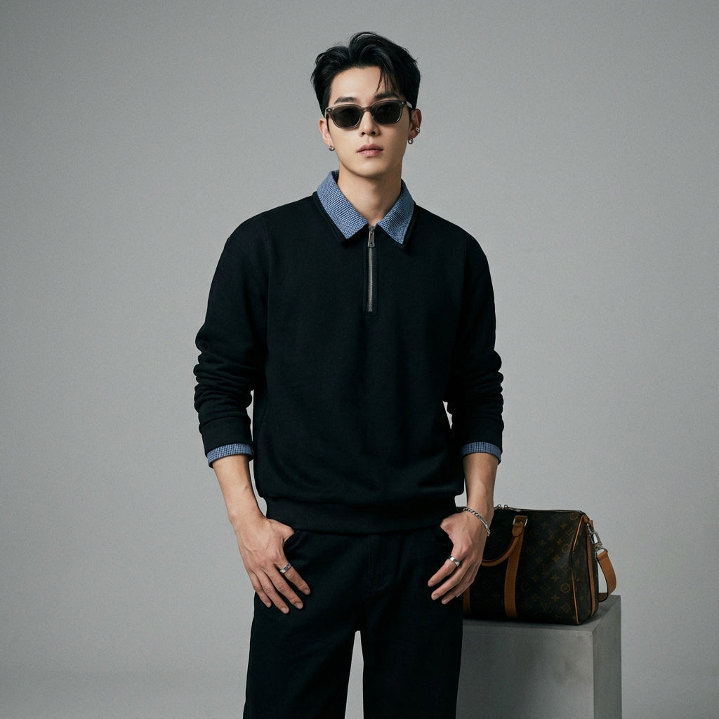- Jenis: T-shirt, Lengan panjang, Kolar lipat, Kesan dua helai. Reka bentuk inovatif yang memberikan ilusi memakai dua helai pakaian untuk penampilan yang bergaya tanpa usaha.