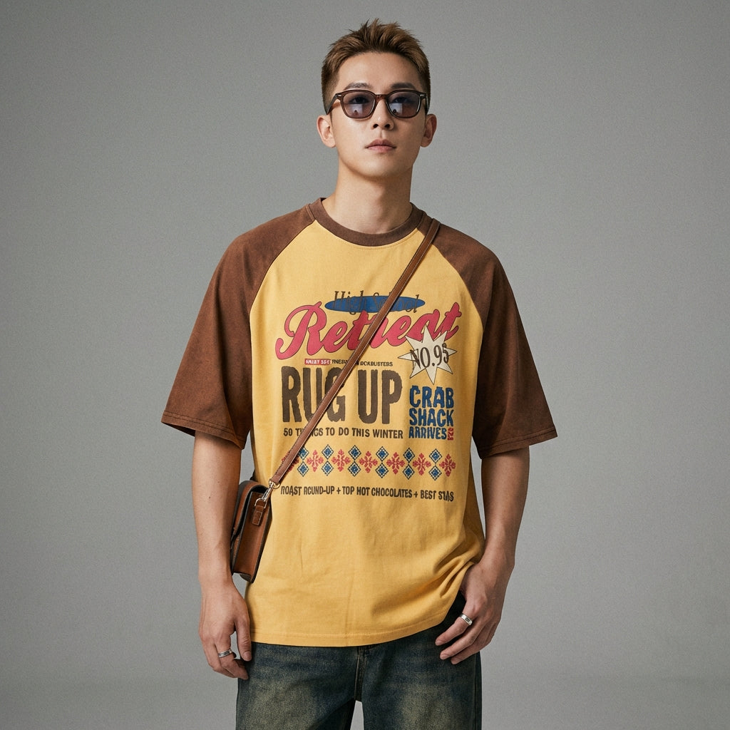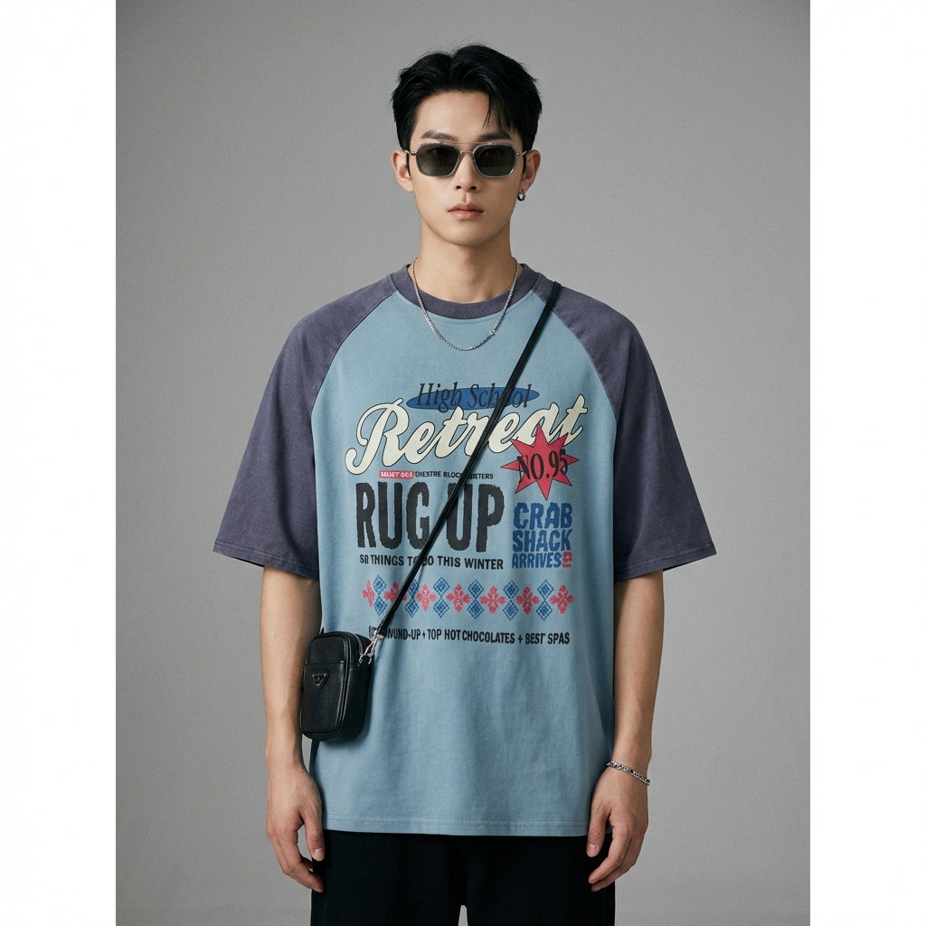 Tegaskan gaya anda dengan t-shirt oversize bercetak huruf ini, sesuai untuk penampilan kasual dan bergaya. Reka bentuk "color block" dan lengan raglan separuh panjangnya menambah sentuhan moden dan unik pada almari pakaian musim panas anda! ☀️