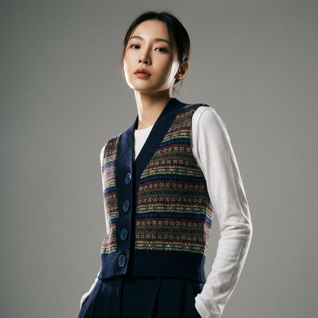 Vest rajutan jacquard ini adalah jemputan untuk menyatakan keperibadian anda sambil kekal mengikut trend Korea terkini. Ia akan sesuai dengan almari pakaian anda untuk gaya yang unik.