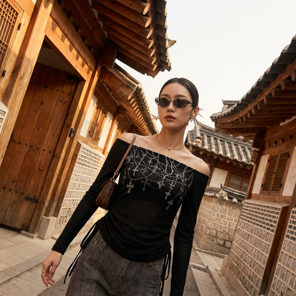 - Stijl: K-fashion, Streetwear, Gedurfd. Deze top belichaamt de geest van de Koreaanse mode, met een vleugje originaliteit en moderniteit.