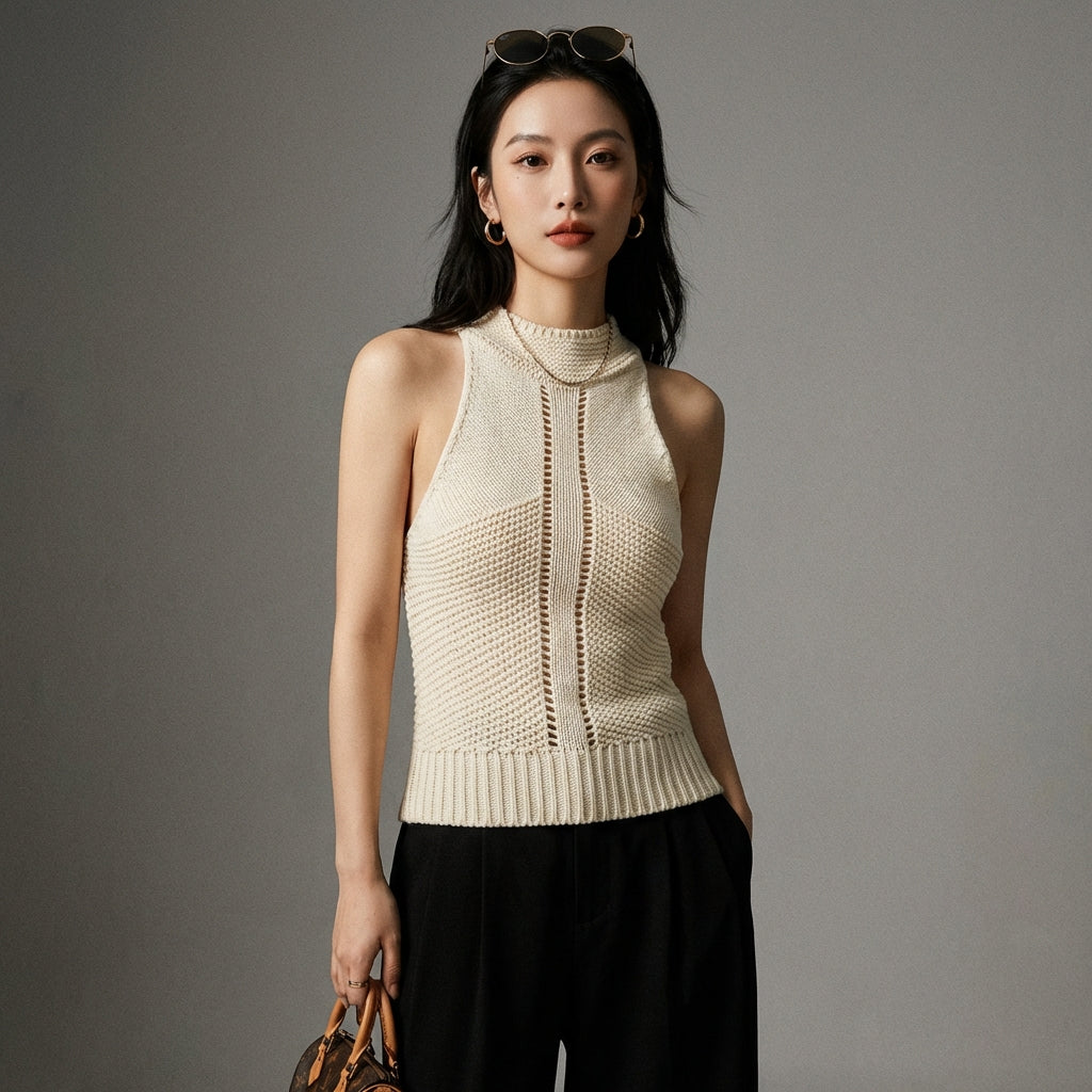 Gilet pull tricoté ajusté beige pour femme - Koreanxwear