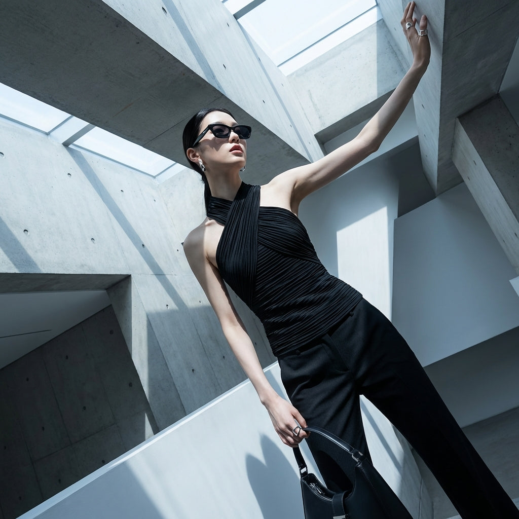Få en trendy look med vår svarte, plisserte, tettsittende og ermeløse topp. Det elegante designet med halterneck og bare skuldre vil fremheve figuren din med subtilitet og stil! ✨