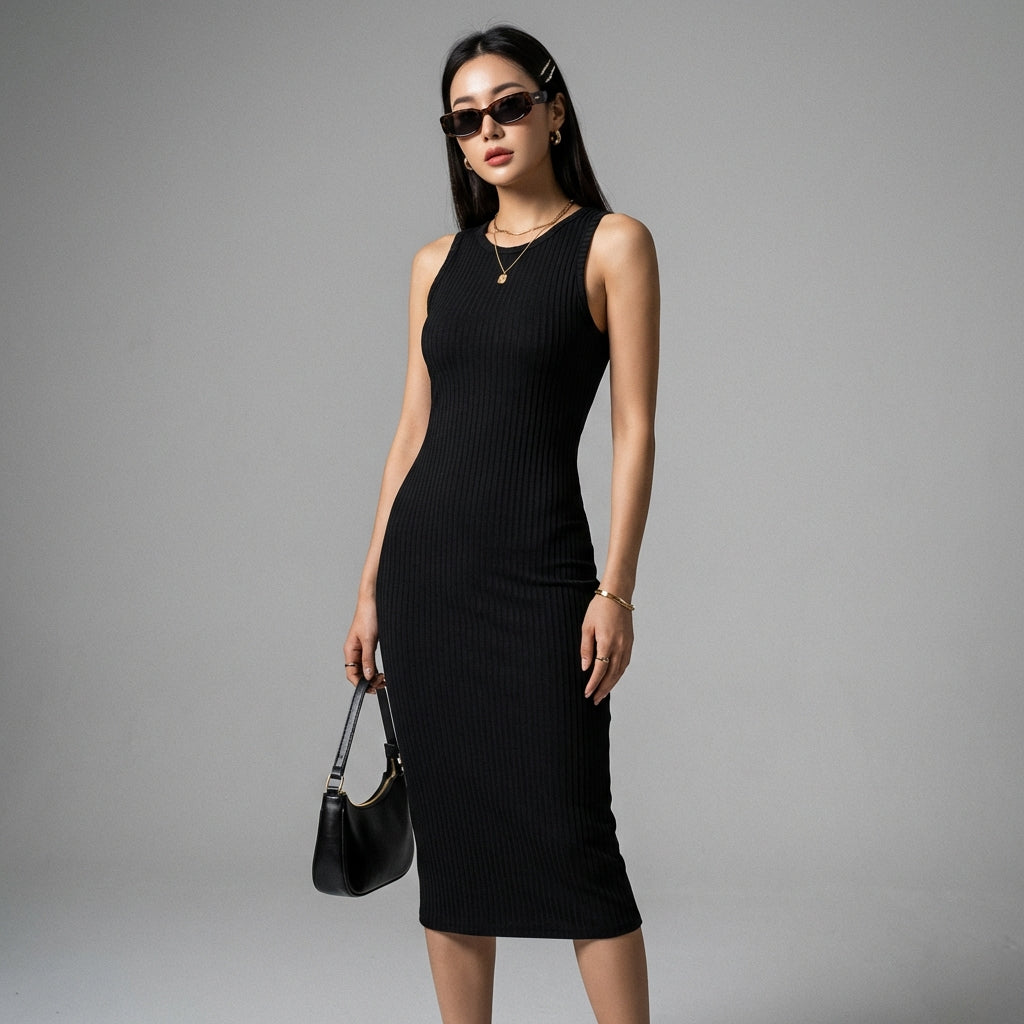 Få en elegant og strømlinjeformet look med vår figurnære midikjole, perfekt for å fremheve silhuetten din. V-halsen og den ermeløse designen gjør den til et elegant must-have for alle anledninger! ✨