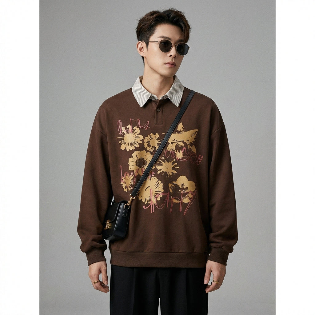 Få en avslappet og trendy look med vår sweatshirt med krage, trykt med bokstaver og blomstermønstre. Dens "falske todelte" design tilbyr en unik og allsidig stil, perfekt for hverdags komfort! ✨