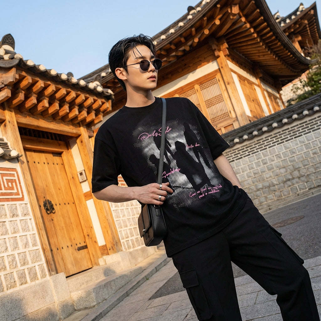 - Stil: Streetwear, K-fashion, Trendy. Denne T-skjorten legemliggjør den avslappede og trendy ånden i urban mote, inspirert av de nyeste koreanske trendene.