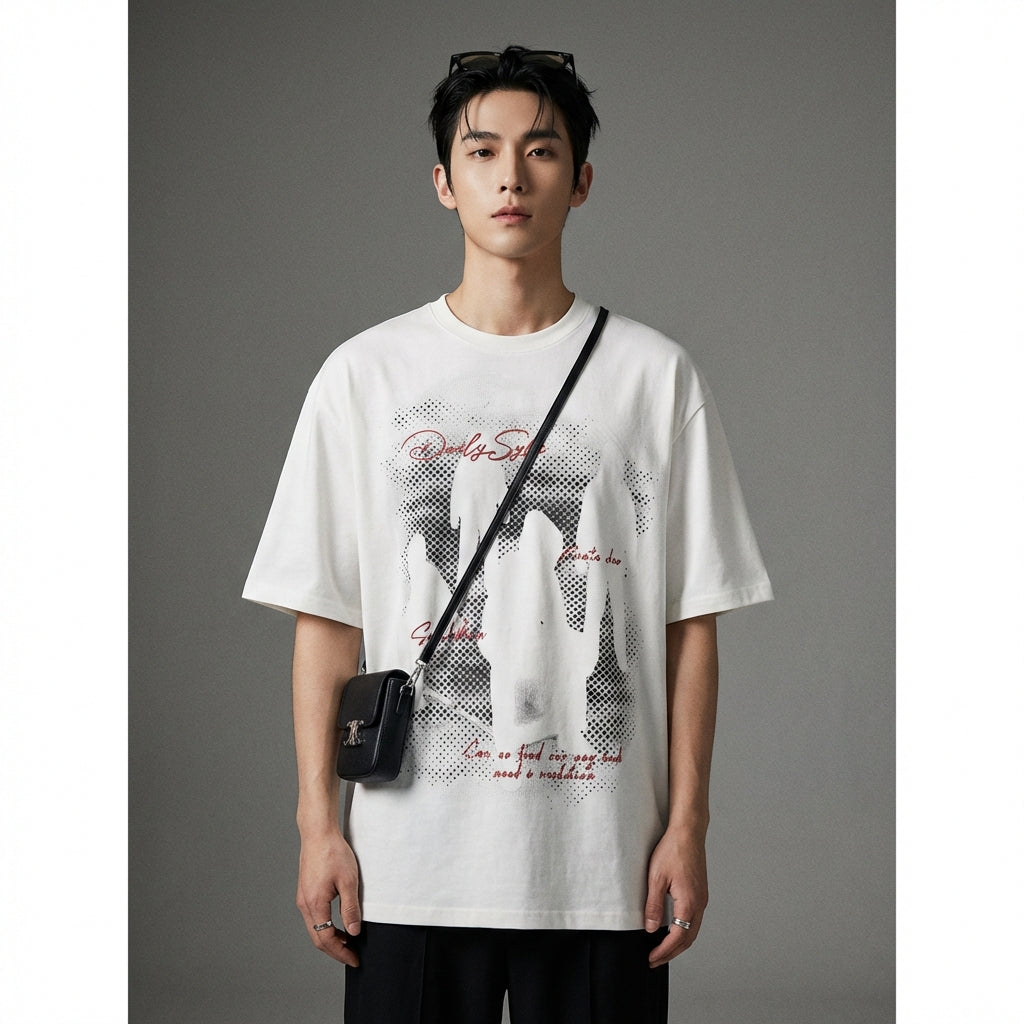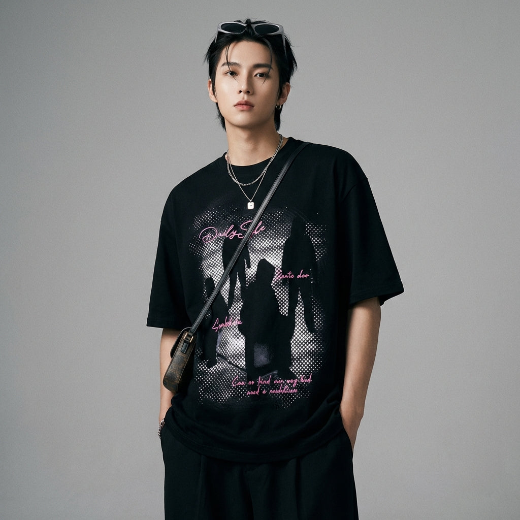 Denne oversized T-skjorten er nøkkelplagget for en selvsikker og avslappet look, som kombinerer komfort og moderne estetikk, et must-have innen K-fashion.