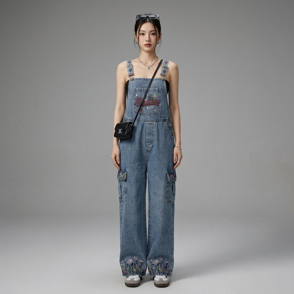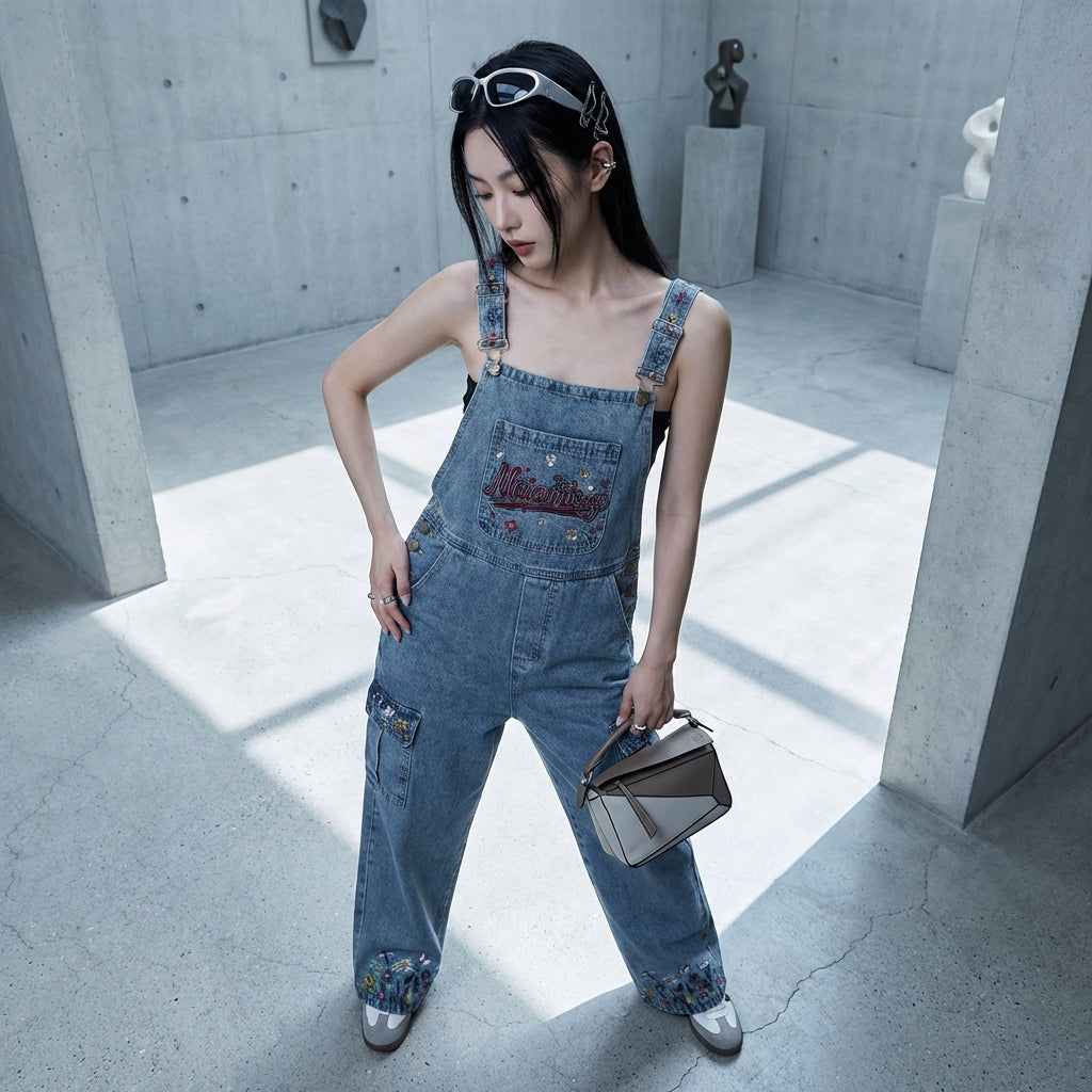 Vis frem stilen din med vår denim-overall, med delikat blomsterbroderi og en trendy vask. Den løse passformen og retro-følelsen gjør den til et statement-plagg for en selvsikker streetwear-look! 👖