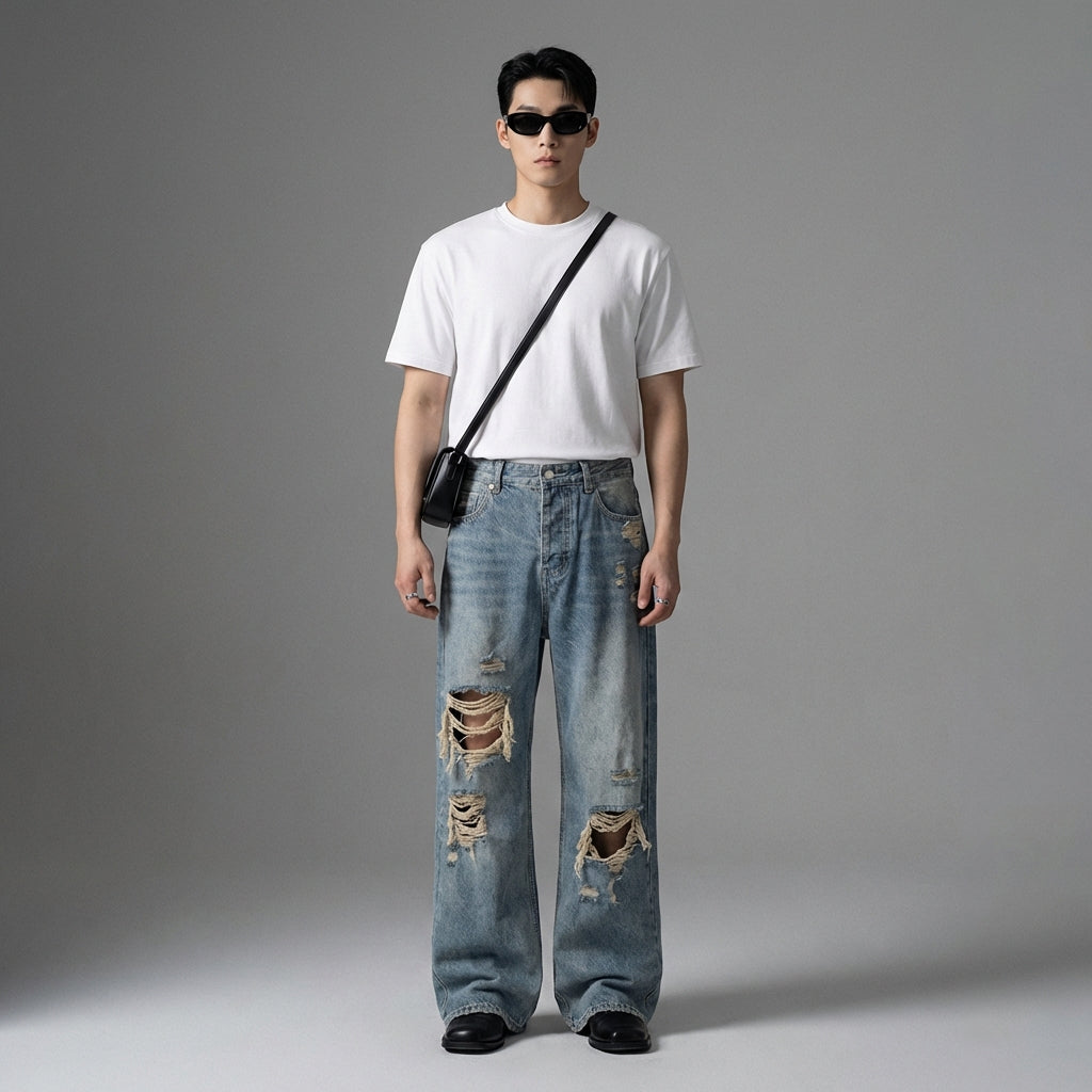 - Stil: Streetwear, Trendy, K-fashion. Disse jeansene legemliggjør ånden av koreansk urban mote, med et snev av moderne avslappethet.