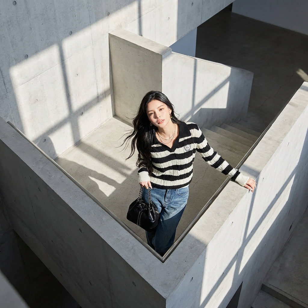 Få en retro-chic look med vår stripete polotrøye med krage. Perfekt for en avslappet og trendy stil, den vil følge deg elegant gjennom høsten og vinteren. Et must for elskere av vintage mote! 🍂