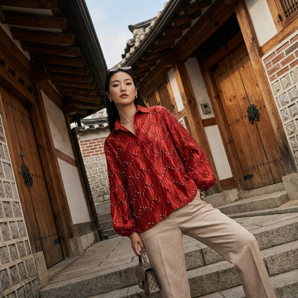 • Styl: K-fashion, Elegancki, Casual. Ta koszula uosabia swobodną elegancję koreańskiej mody, z nutką blasku.