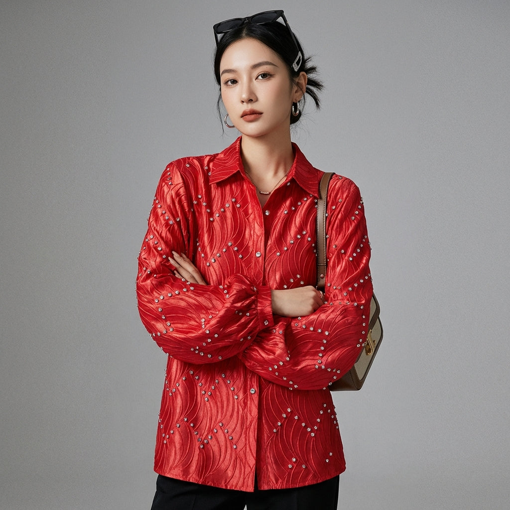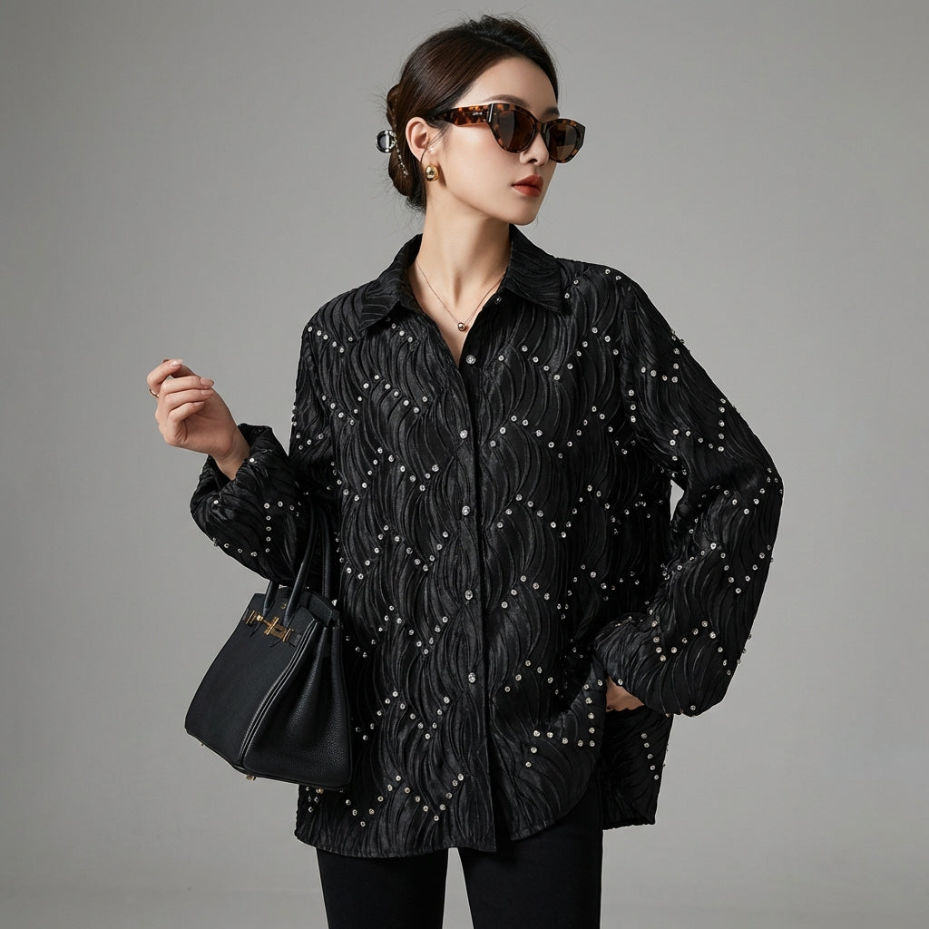 Chemise col polo femme ornée de diamants - K-fashion élégante - Taille one size