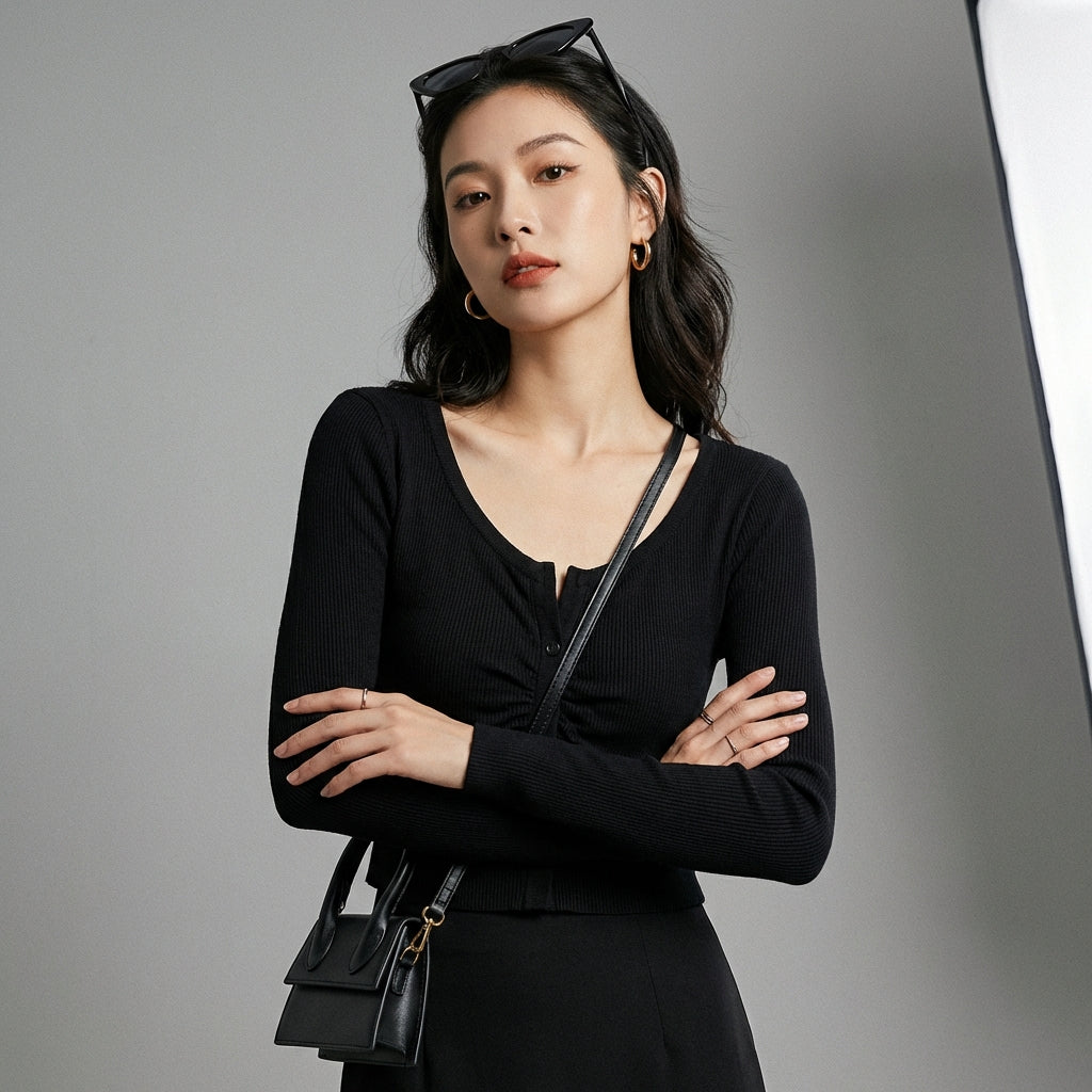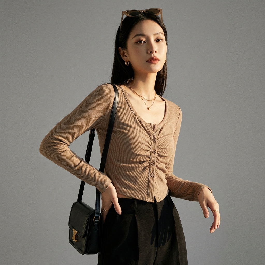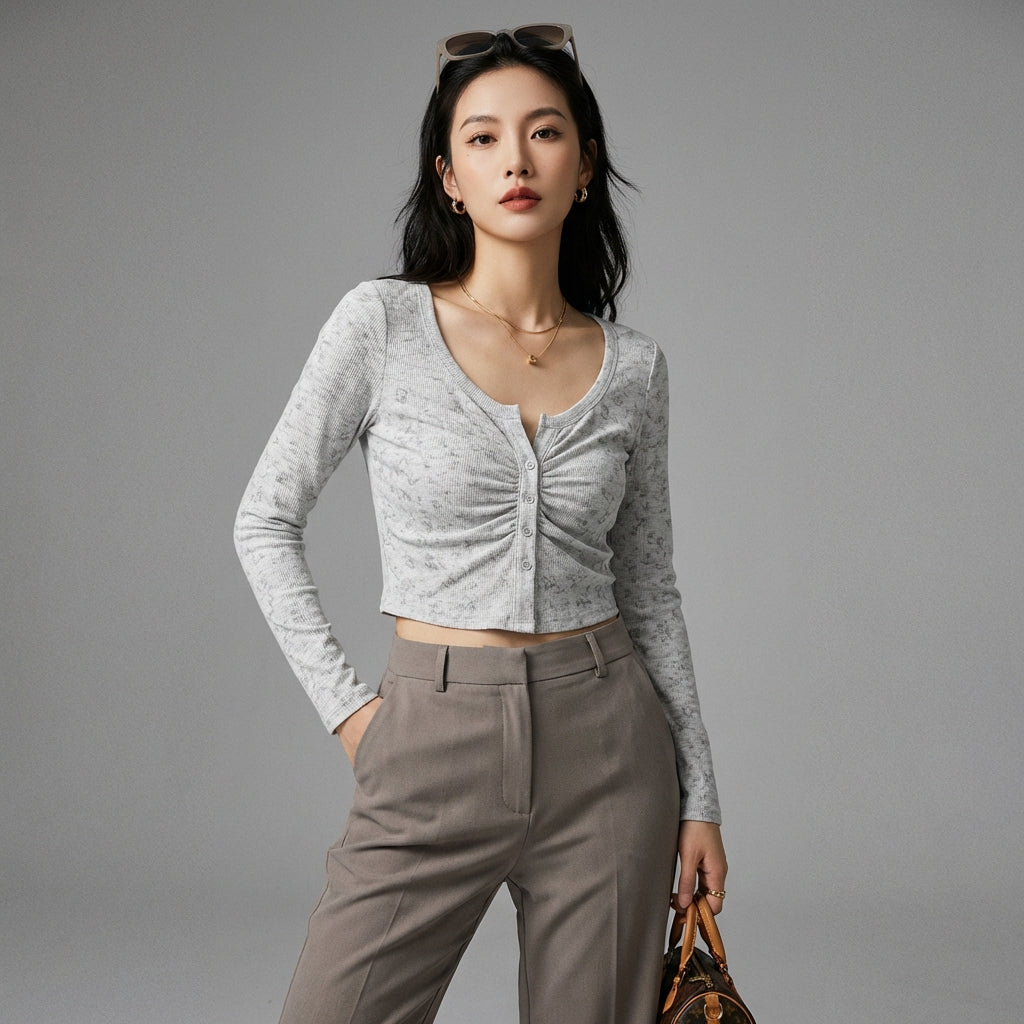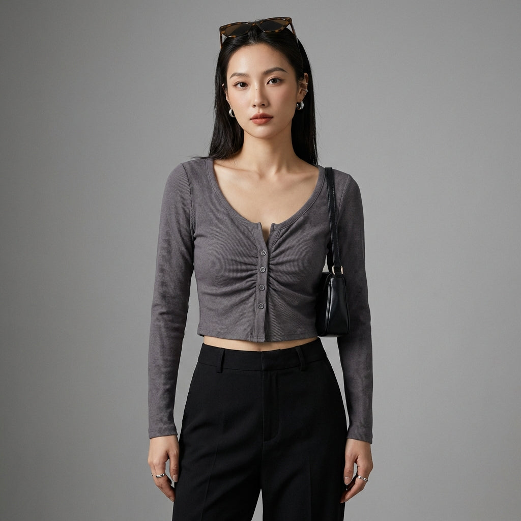 Przyjmij elegancki i swobodny wygląd dzięki naszemu plisowanemu T-shirtowi z dekoltem w serek i długimi rękawami. Jego dopasowany krój i minimalistyczny design sprawiają, że jest to niezbędny element garderoby na każdą porę roku, idealny do nowoczesnego i eleganckiego wyglądu! ✨