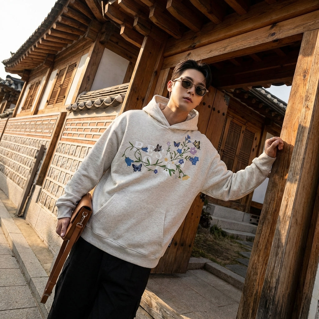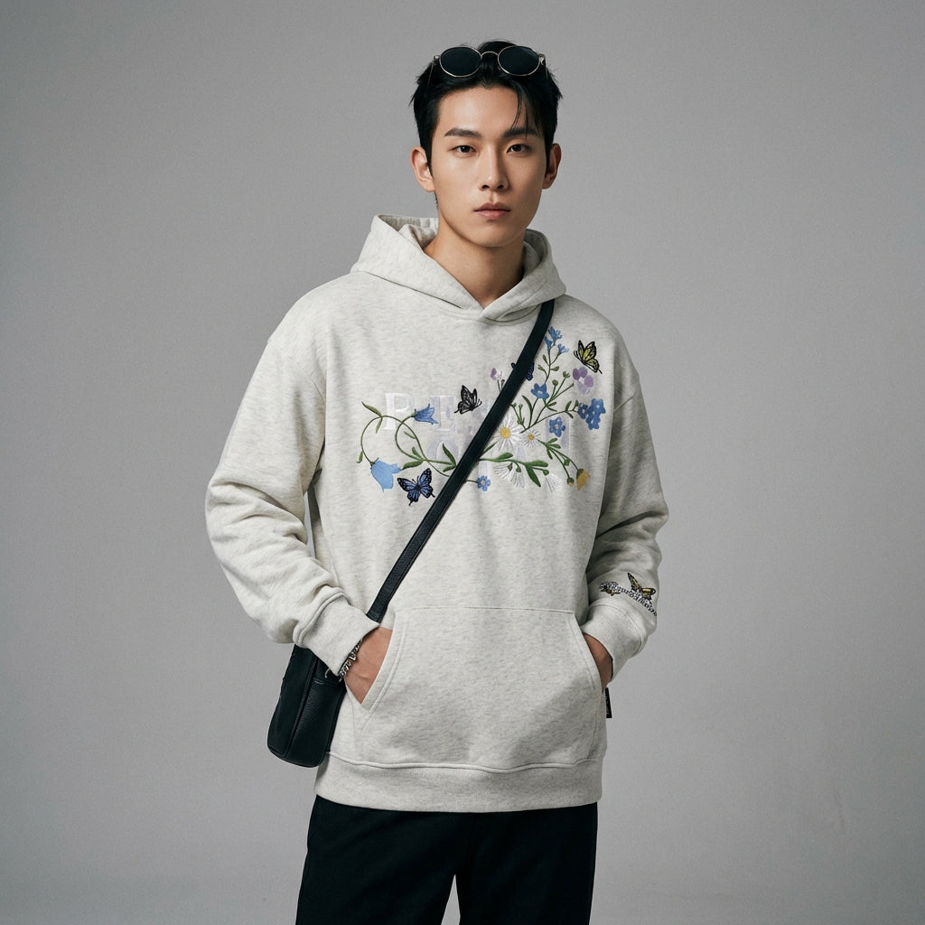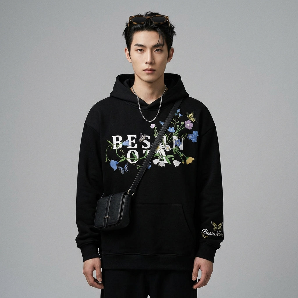 Przyjmij swobodny i modny styl dzięki naszej bluzie z kapturem ozdobionej delikatnym haftem kwiatowym. Idealna, aby dodać odrobinę oryginalności do codziennych stylizacji, łączy w sobie komfort i nowoczesną estetykę. Niezbędna dla szykownego wyglądu streetwear! 🌼