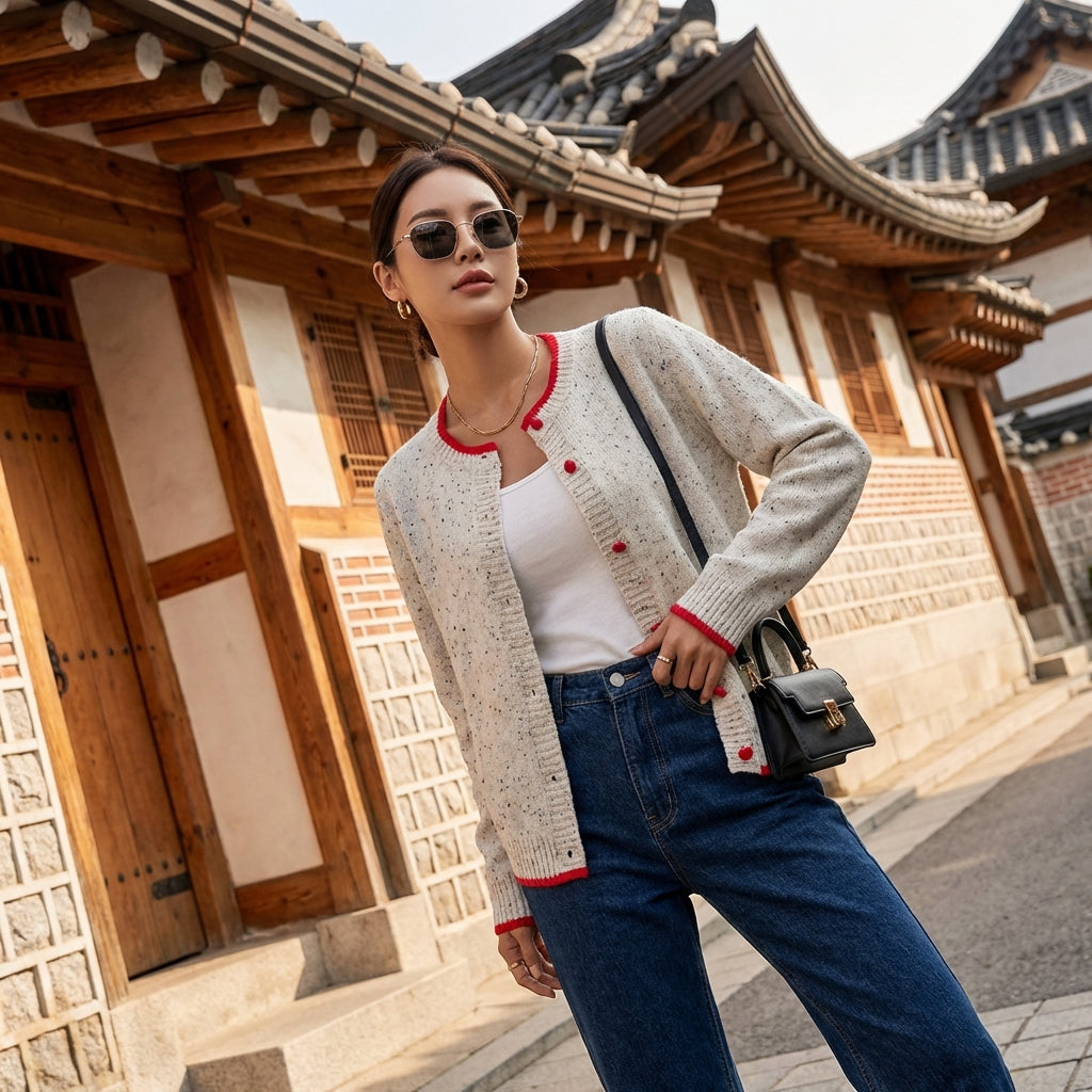 - Styl: K-fashion, Elegancki, Swobodny. Ten kardigan ucieleśnia swobodną elegancję koreańskiej mody, idealny do codziennego szykownego wyglądu.