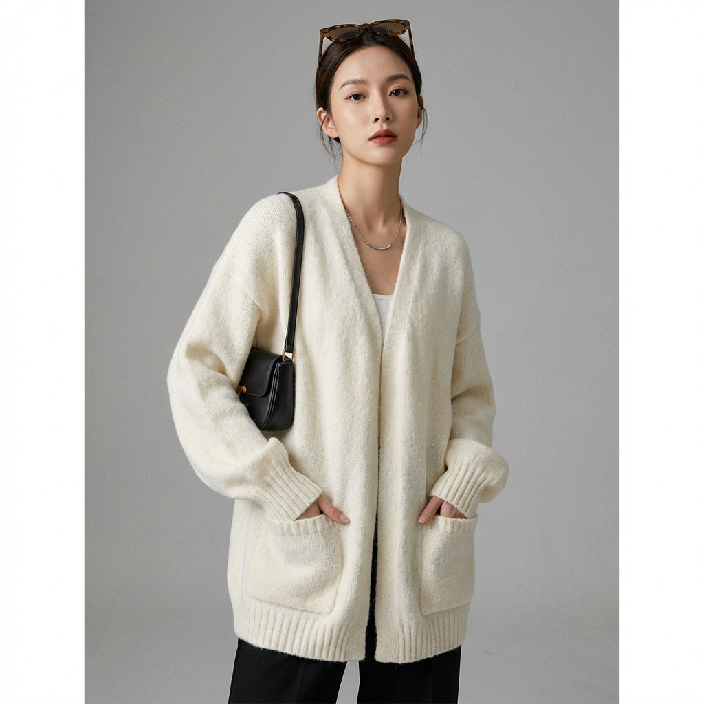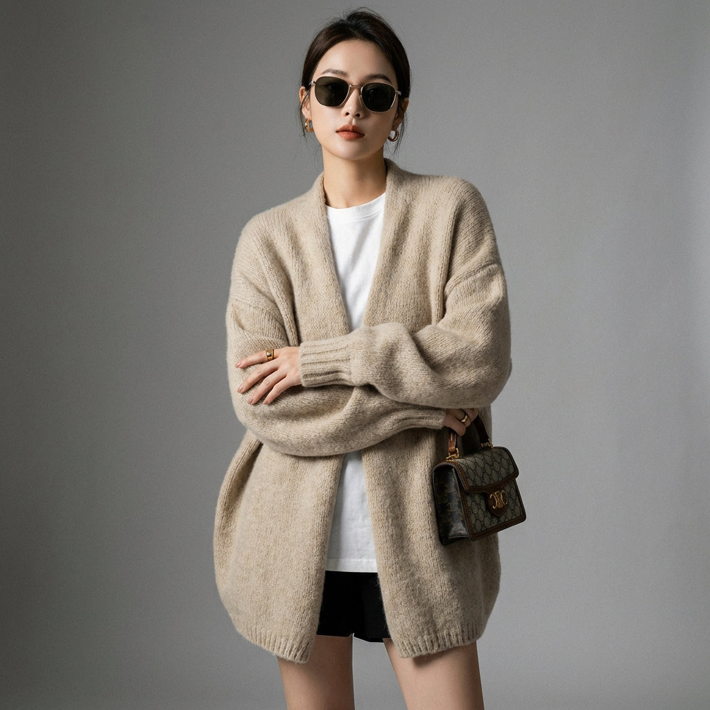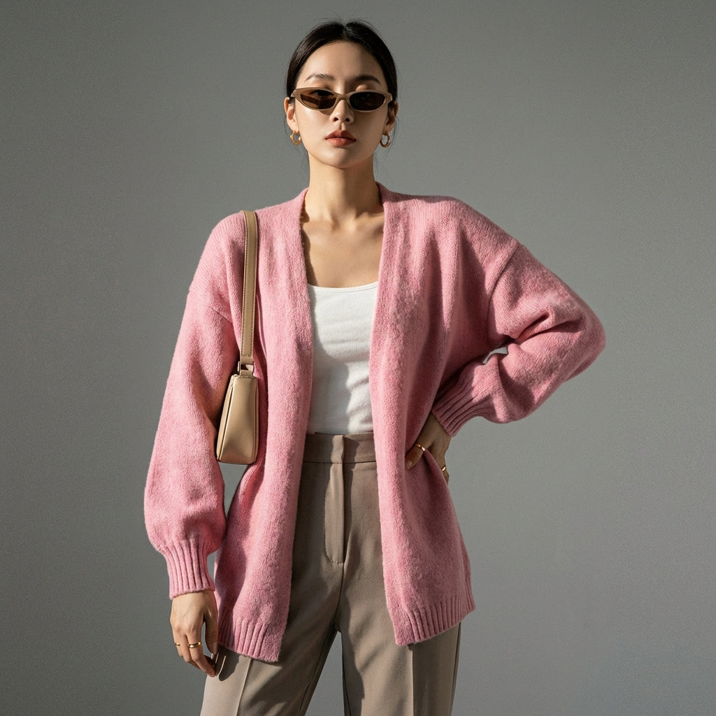 - Style : Minimaliste, Doux, K-fashion. Ce cardigan incarne l'esthétique épurée et confortable de la mode coréenne, idéal pour un look décontracté et tendance.
