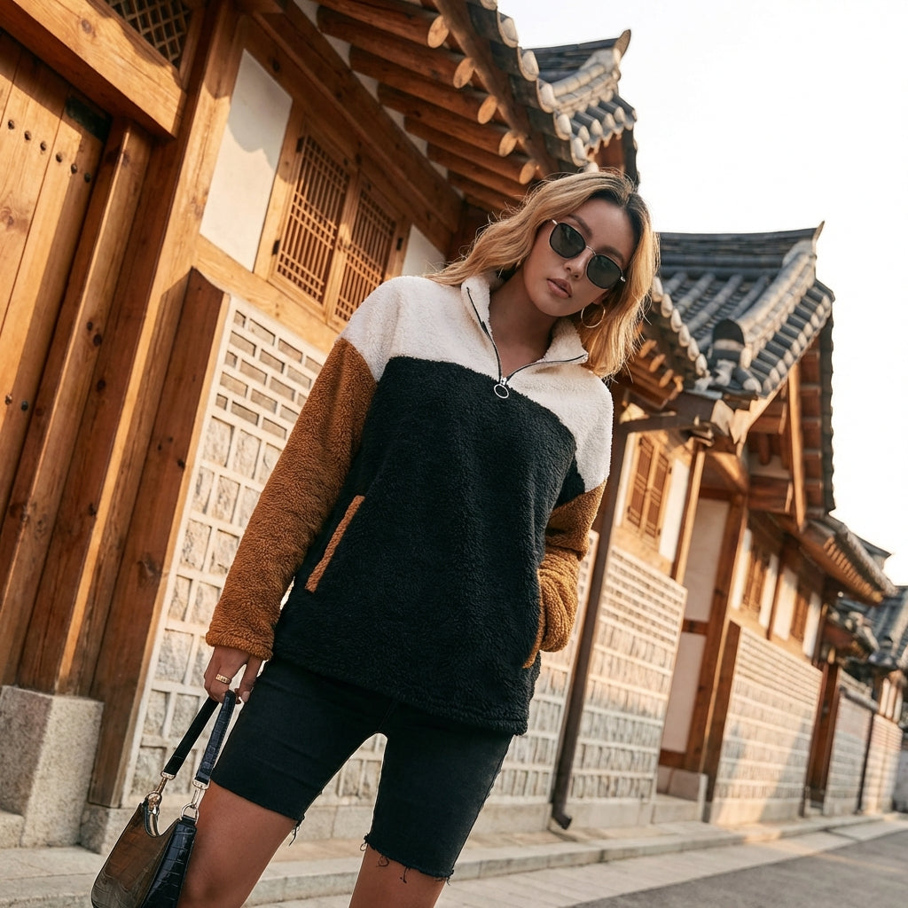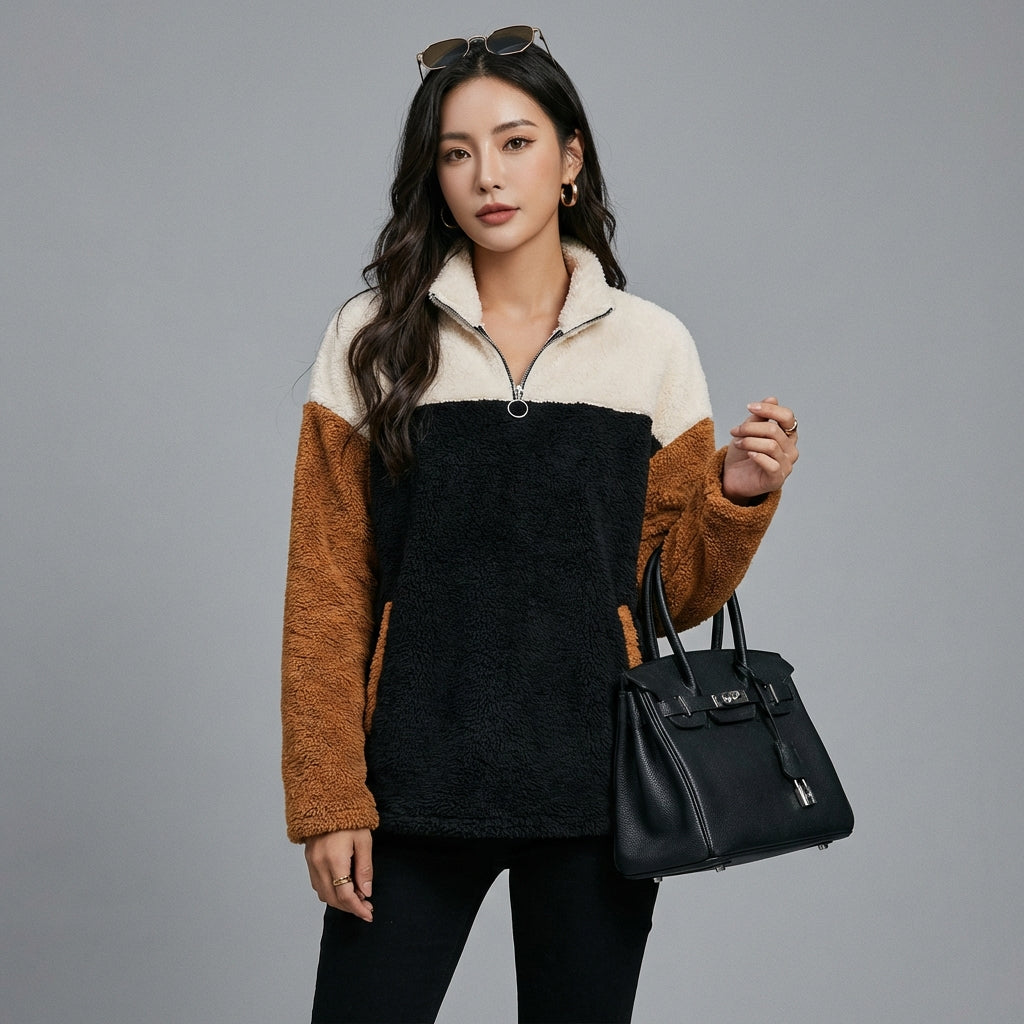 Adoptez un look décontracté et tendance avec notre hoodie en peluche bicolore. Ce haut douillet combine confort et style avec ses blocs de couleur contrastés et sa poche plaquée pratique. Parfait pour rester au chaud avec une touche mode ! 🌟