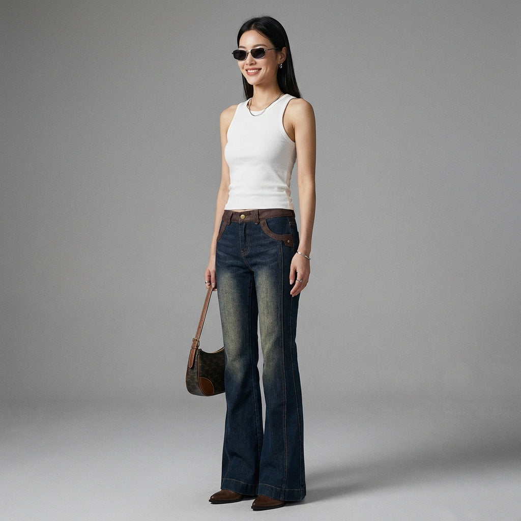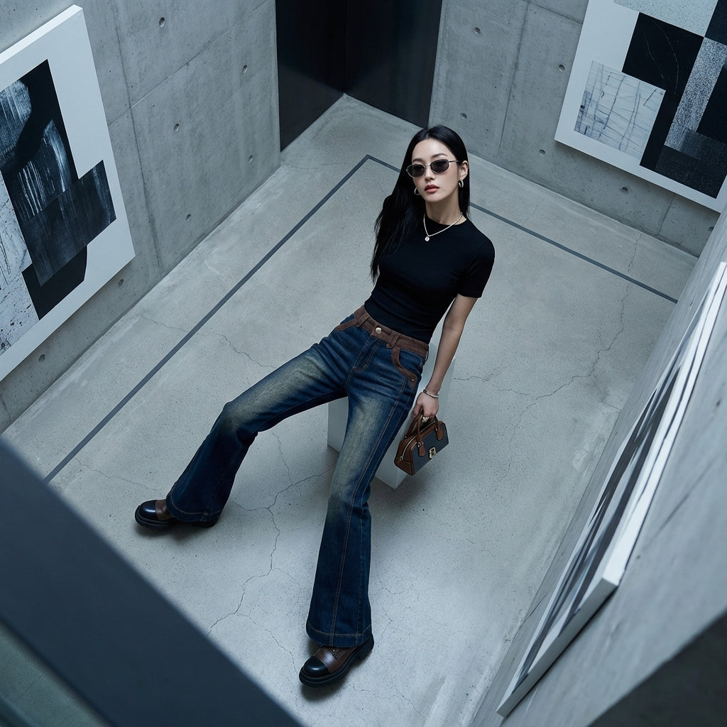 Ce pantalon flare denim bicolore est un incontournable pour celles qui souhaitent exprimer leur individualité et leur passion pour la mode coréenne avec audace et élégance.