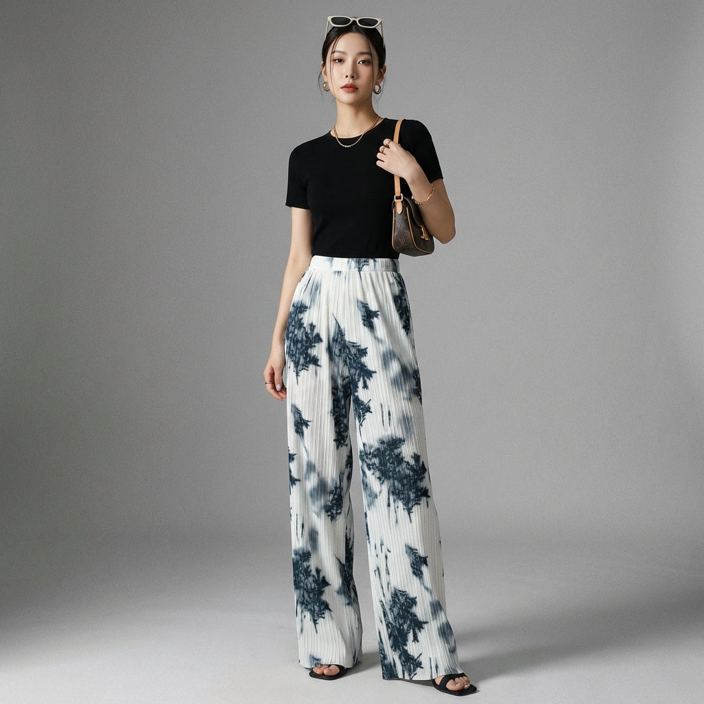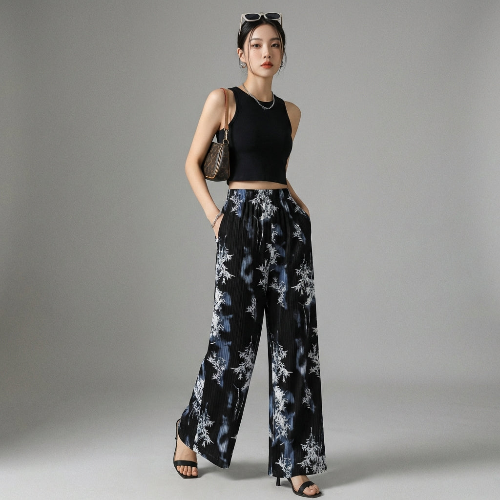 Pantalon large imprimé fluide taille haute noir - Koreanxwear - Taille one size
