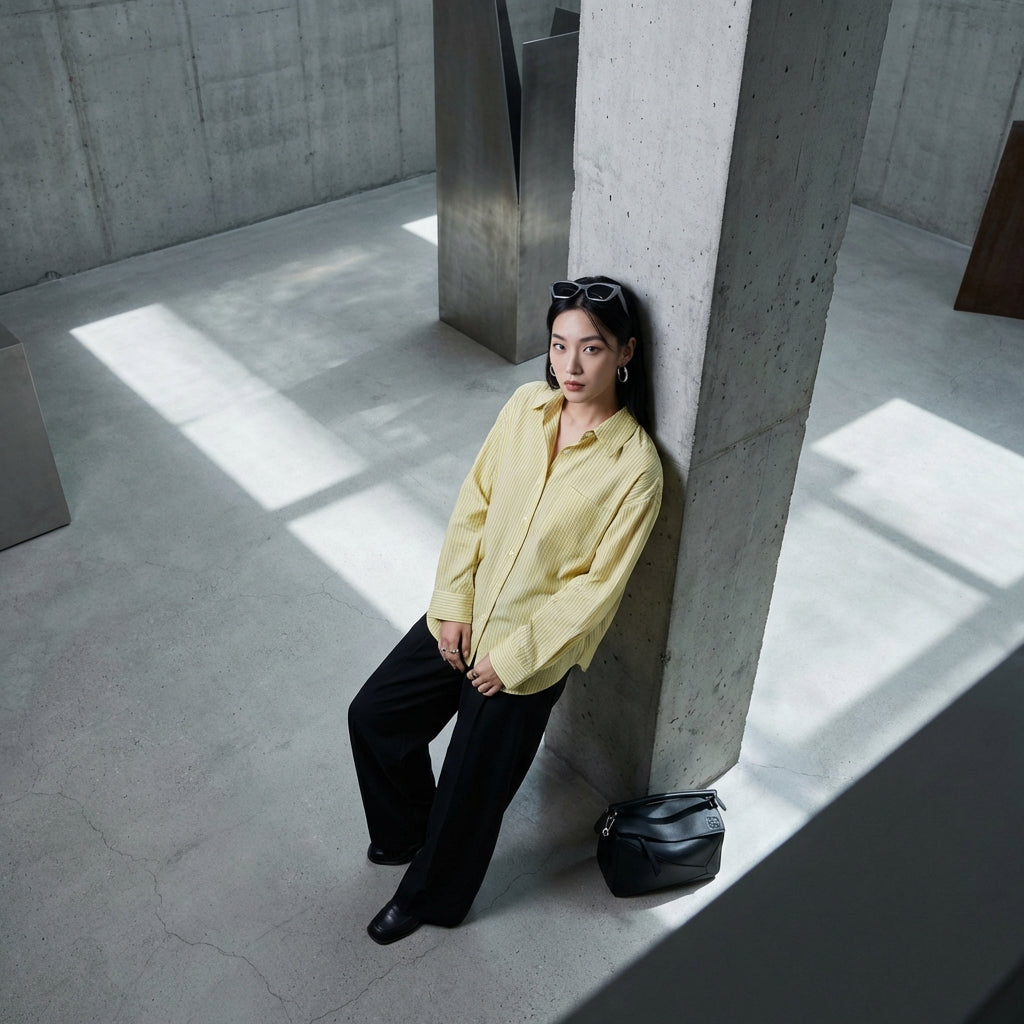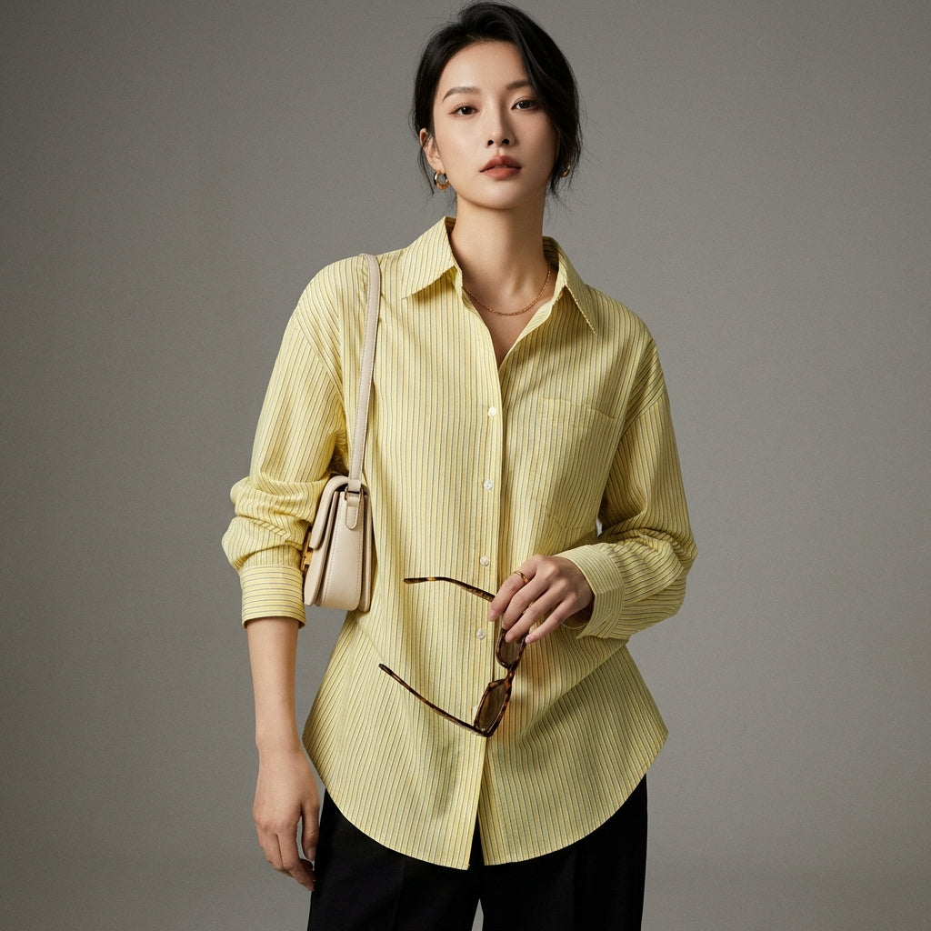 Com esta camisa listrada, adicione um toque de sofisticação casual ao seu guarda-roupa, inspirada nas últimas tendências da moda coreana.