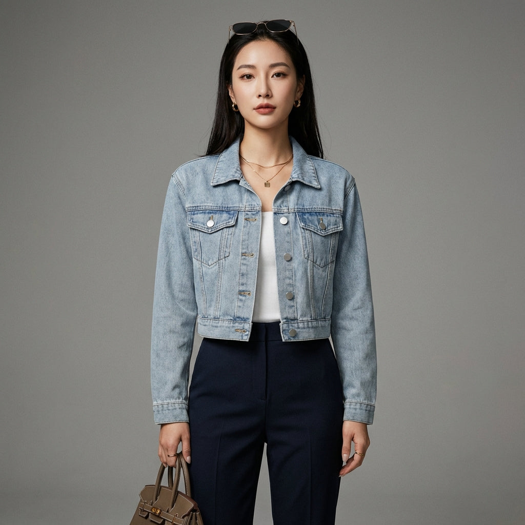 Adote um visual descontraído e estiloso com nossa jaqueta curta jeans lavada. Perfeita para sobrepor e criar looks modernos, esta peça versátil é um item essencial no seu guarda-roupa para um visual moderno e despreocupado! ✨