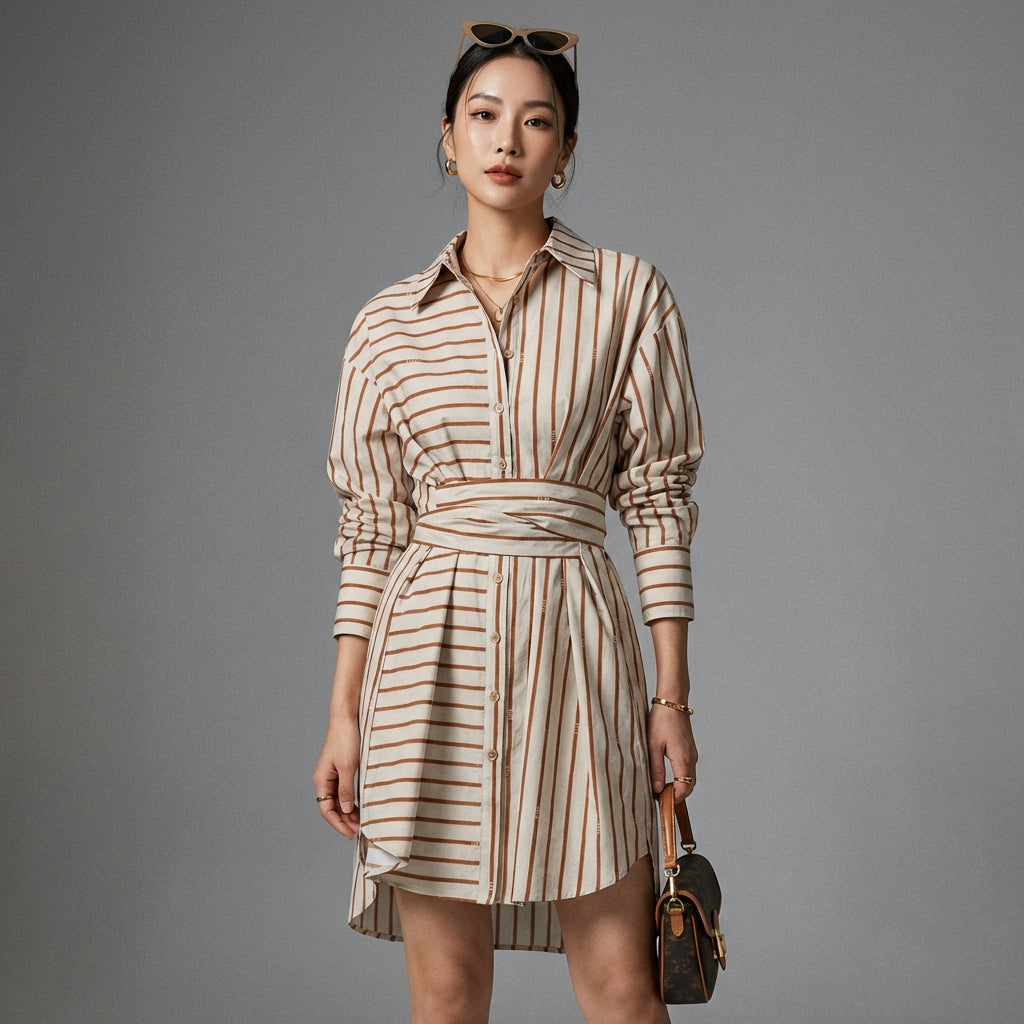 Adote um visual ousado e sofisticado com nosso vestido chemise longo, caracterizado por suas listras contrastantes e design assimétrico. Com gola lapela e mangas longas, ele adiciona um toque de modernidade ao seu guarda-roupa. Perfeito para um estilo marcante e moderno! ✨