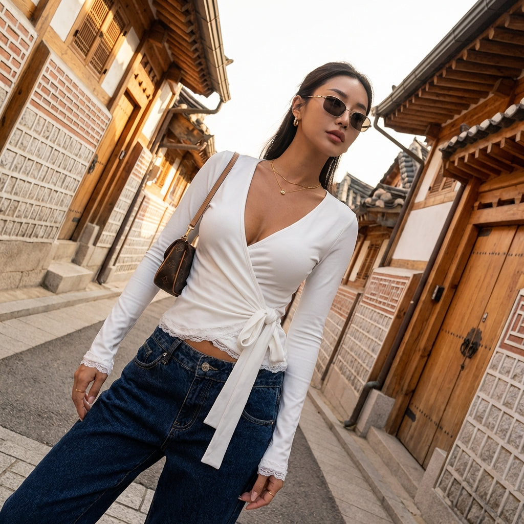 - Estilo: Moda coreana, Tendência, Minimalista. Este top incorpora a elegância discreta e moderna da K-fashion, ideal para um estilo clean.