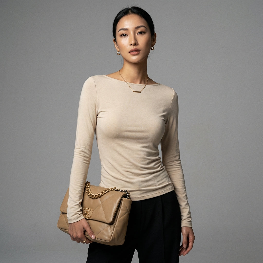 Adote um visual elegante e refinado com nossa camiseta justa de manga longa e gola canoa. Seu corte slim valorizará sua silhueta para um look moderno e atemporal! ✨